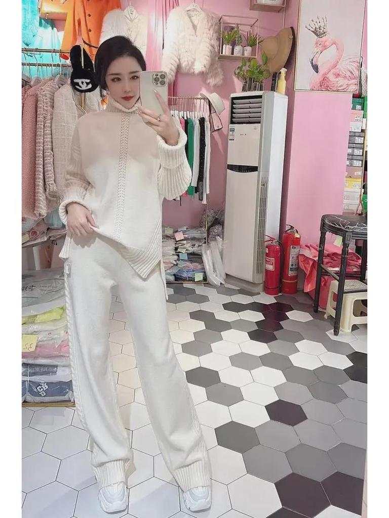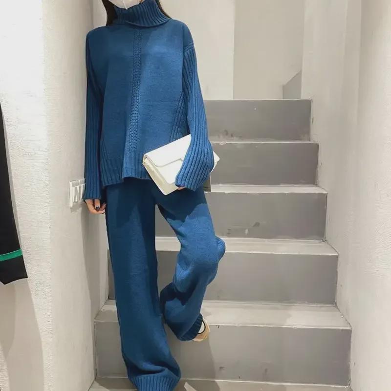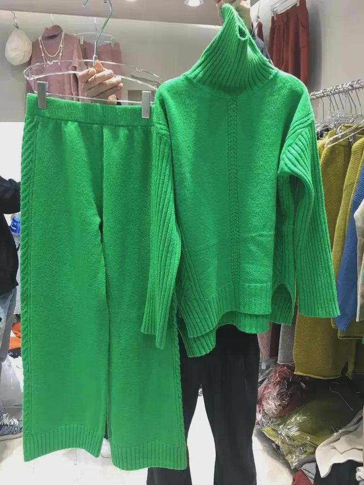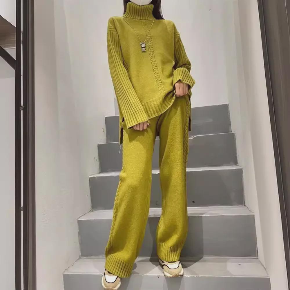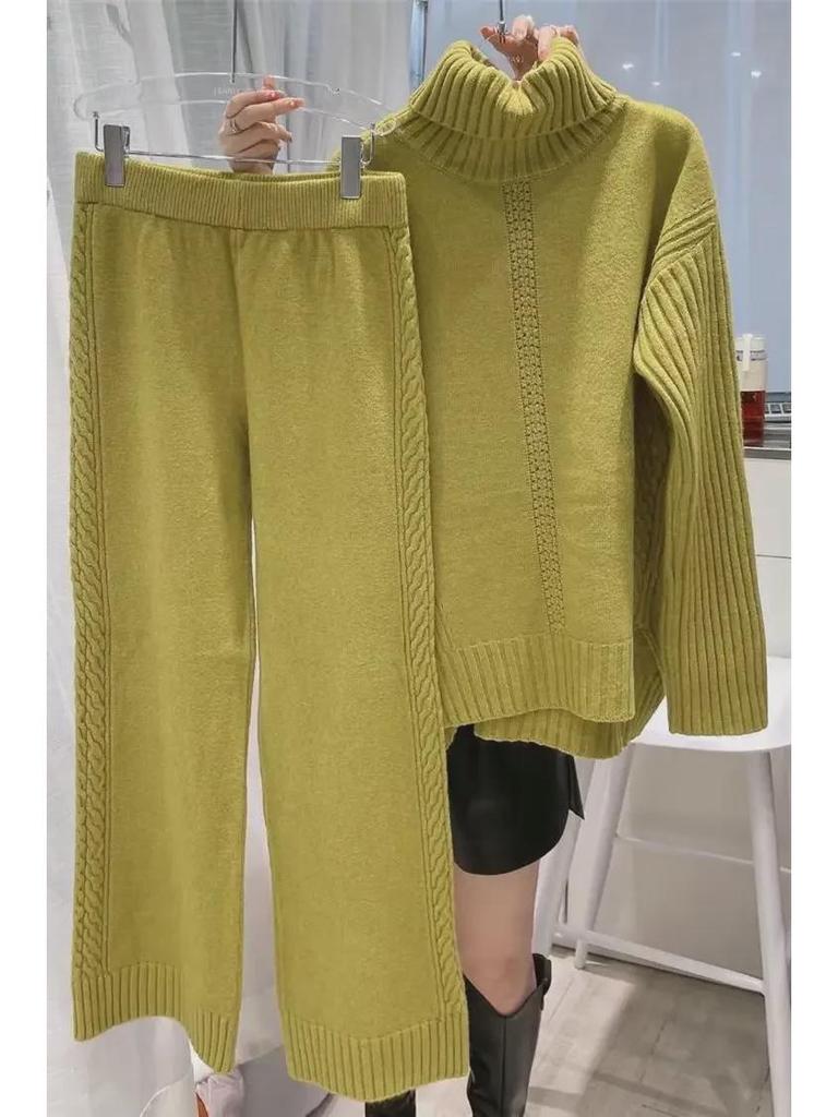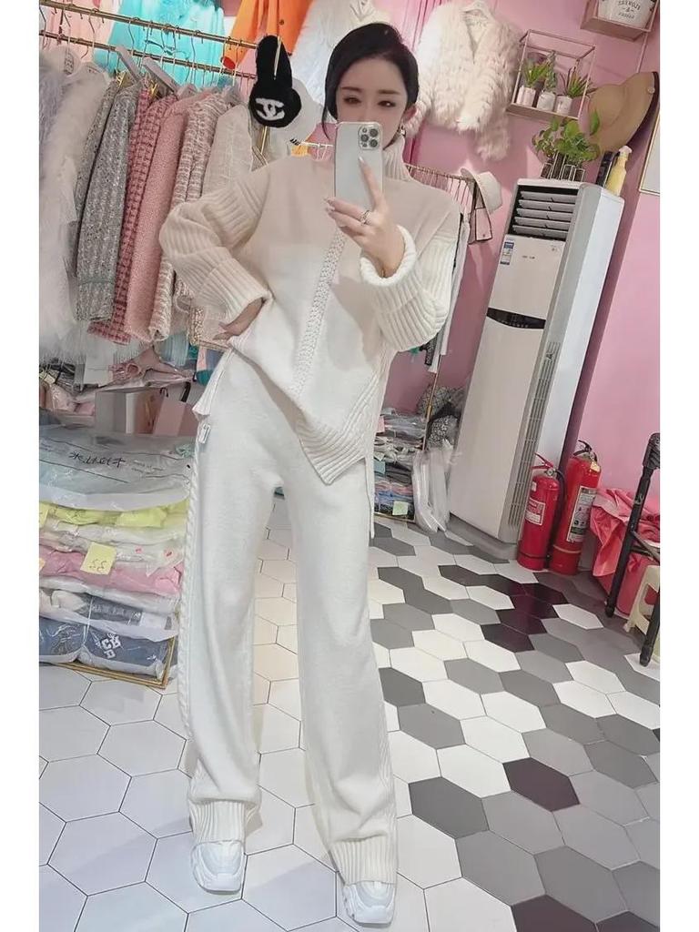 2023 Осень/Зима Европейский трикотажный свитер с высоким воротом и широкие брюки Модный женский костюм из двух частей