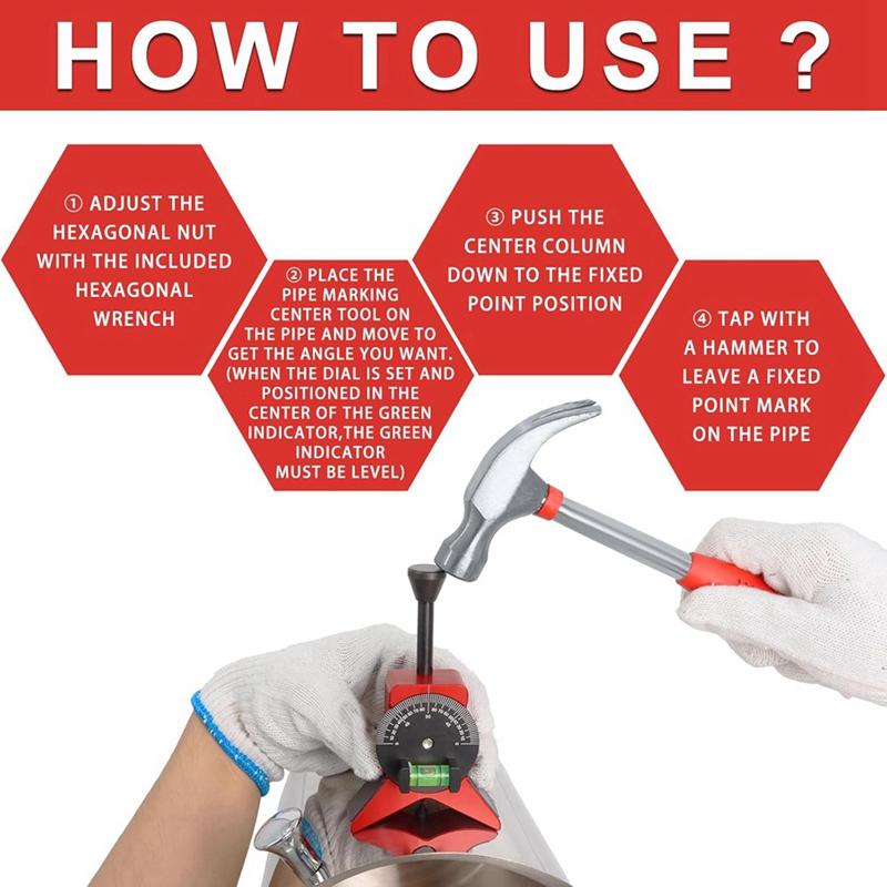[Легко использовать]: 1. Отрегулируйте шестигранную гайку с помощью прилагаемой отвертки.. 2. Поместите центральный инструмент для маркировки труб на трубу и перемещайте его, чтобы получить нужный угол.. (Когда циферблат установлен и расположен в центре зеленого индикатора, зеленый индикатор должен быть выровнен) 3. Опустите центральную колонну вниз до фиксированного положения.. 4. Постучите молотком, чтобы оставить на трубе фиксированную отметку.