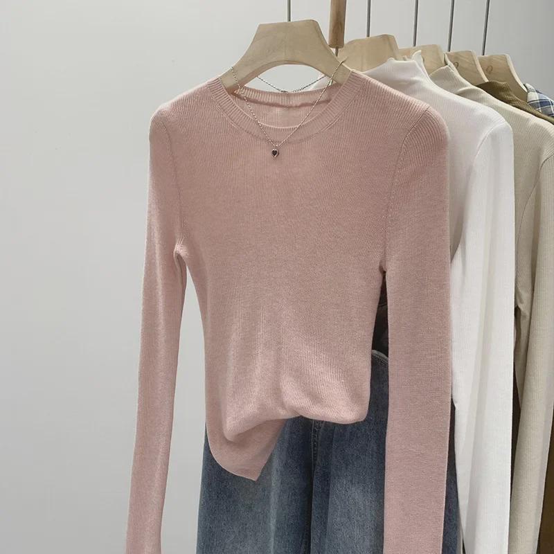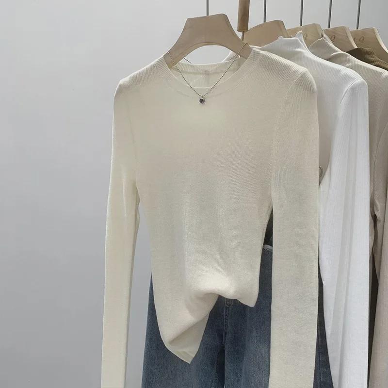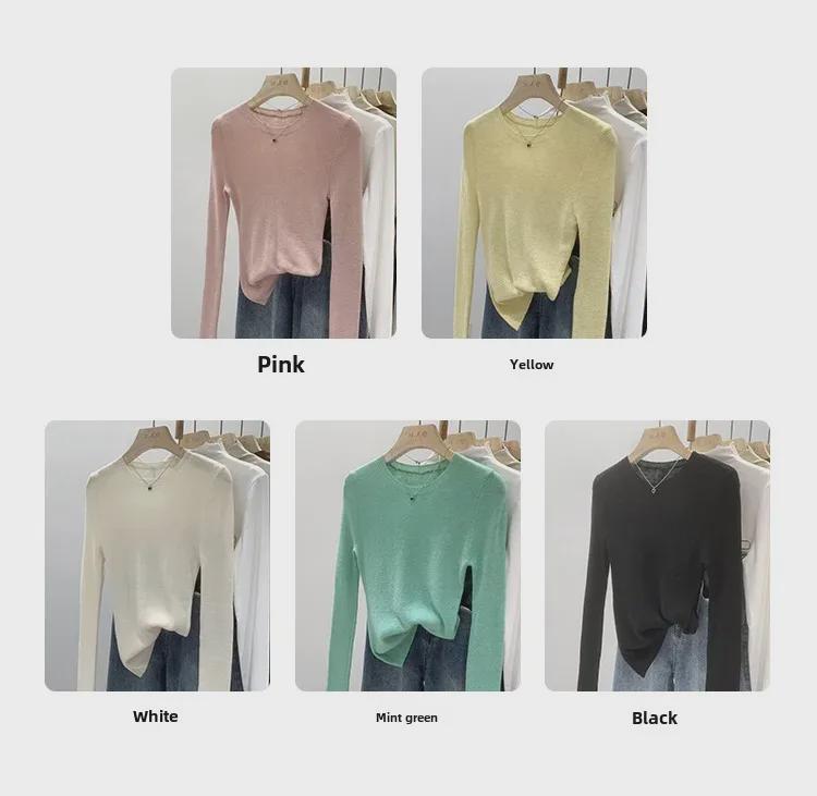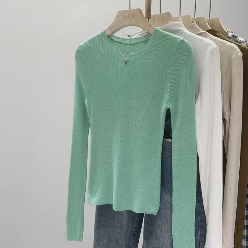 Женский трикотажный пуловер с круглым вырезом мятно-зеленого цвета — облегающий крой, длинный рукав, прозрачный верх для весны/осени