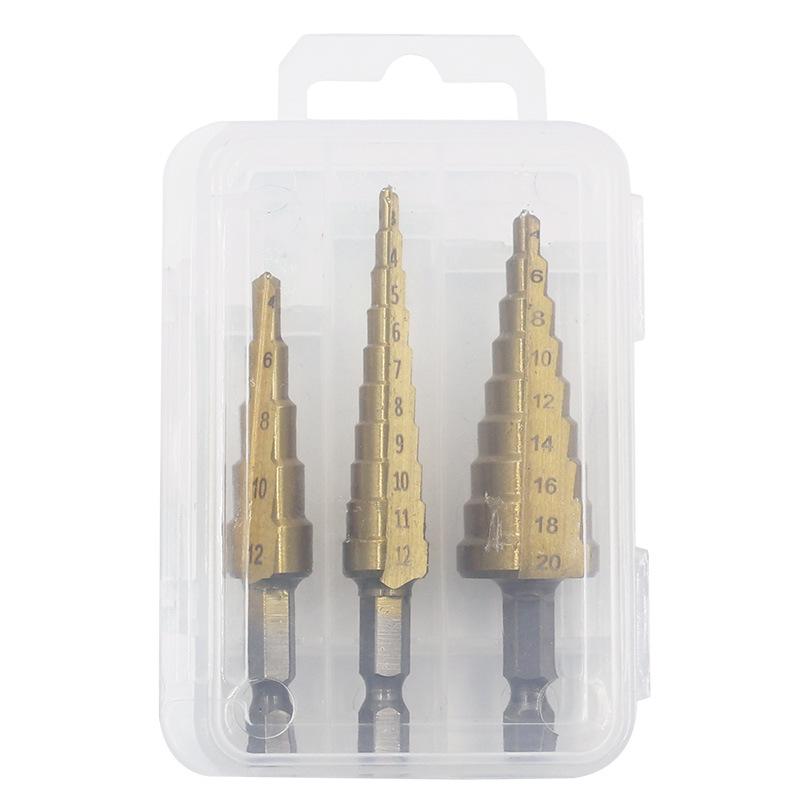 Набор титановых ступенчатых сверл с шестигранным хвостовиком: Пагодные сверла 3-12 мм, 4-12 мм, 4-20 мм