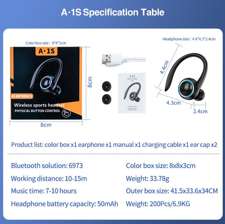 Новая беспроводная Bluetooth-гарнитура с заушным креплением A1S: Миниатюрные внутриканальные стереонаушники, идеально подходят для занятий спортом, бега и бизнеса.