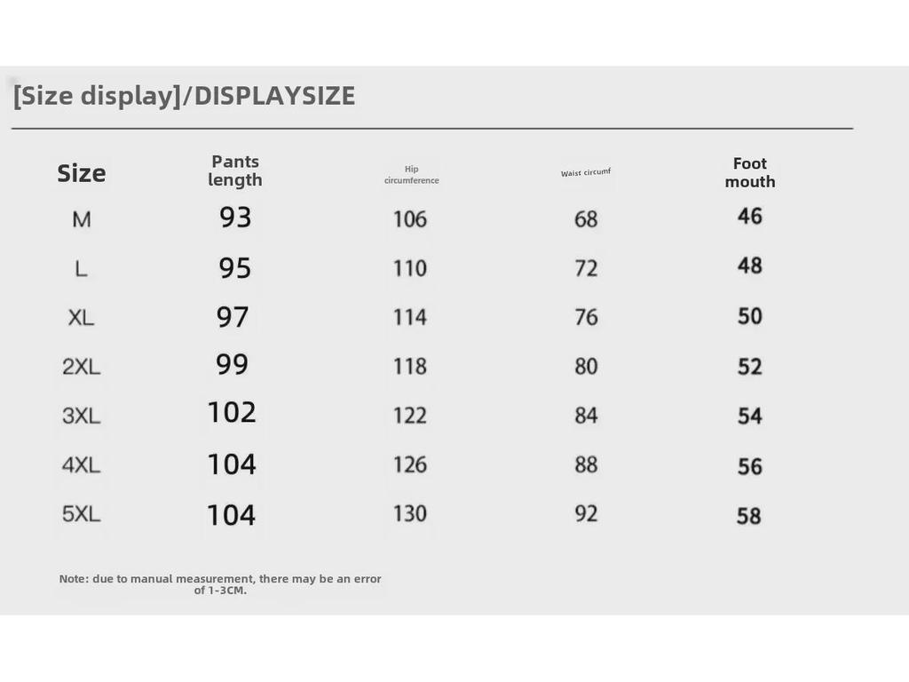 размер: 5XL, Длина брюк: 104 см, обхват бедер: 130 см, окружность талии: 92см, Ящур: 58см.