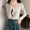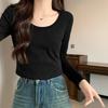 Белая Серая Хлопковая Женская Футболка с Большим U-образным Вырезом и Длинным Рукавом Осенне-Зимнего Дизайна, Открывающая Ключицы, Эластичный Облегающий Базовый Топ
