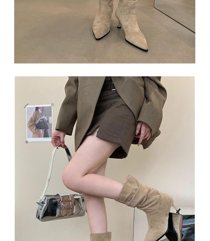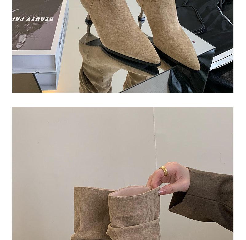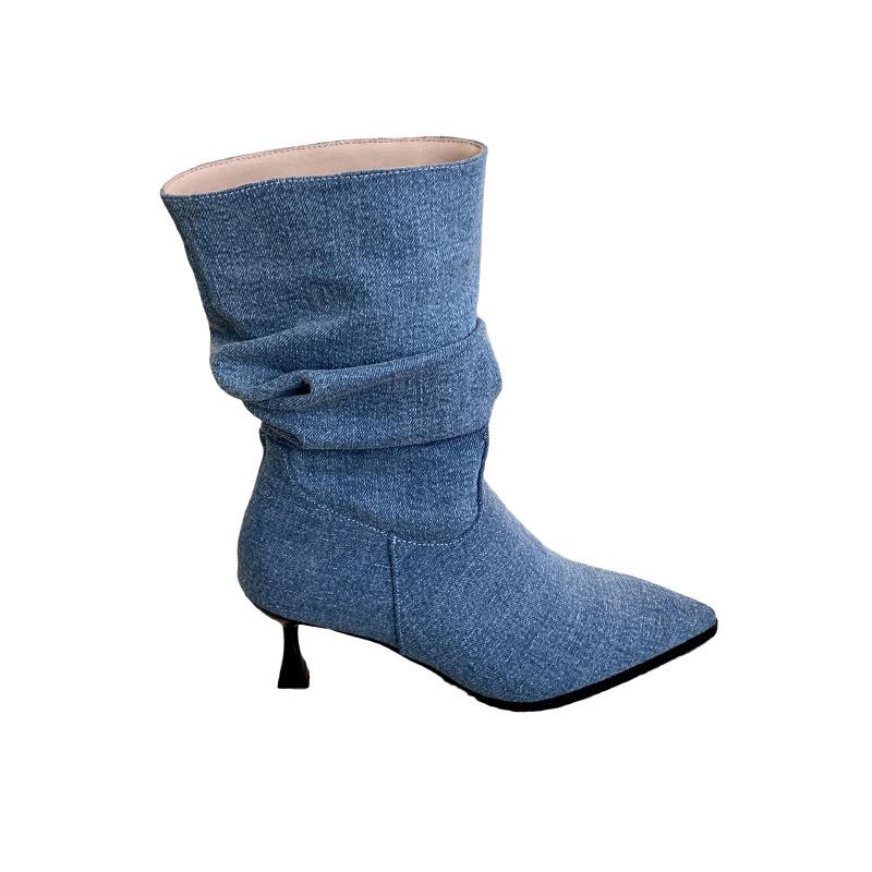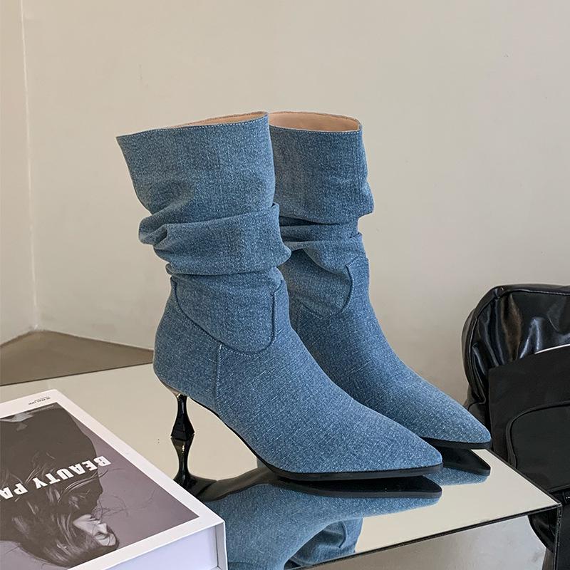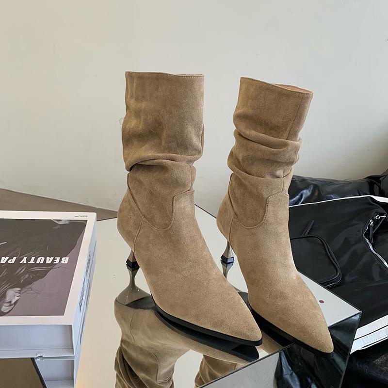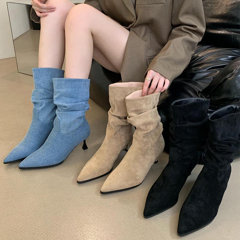 Женские сапоги в стиле ретро на тонком каблуке с острым носком, осень 2024 г. - короткие сапоги средней длины со складками в европейском и американском стиле