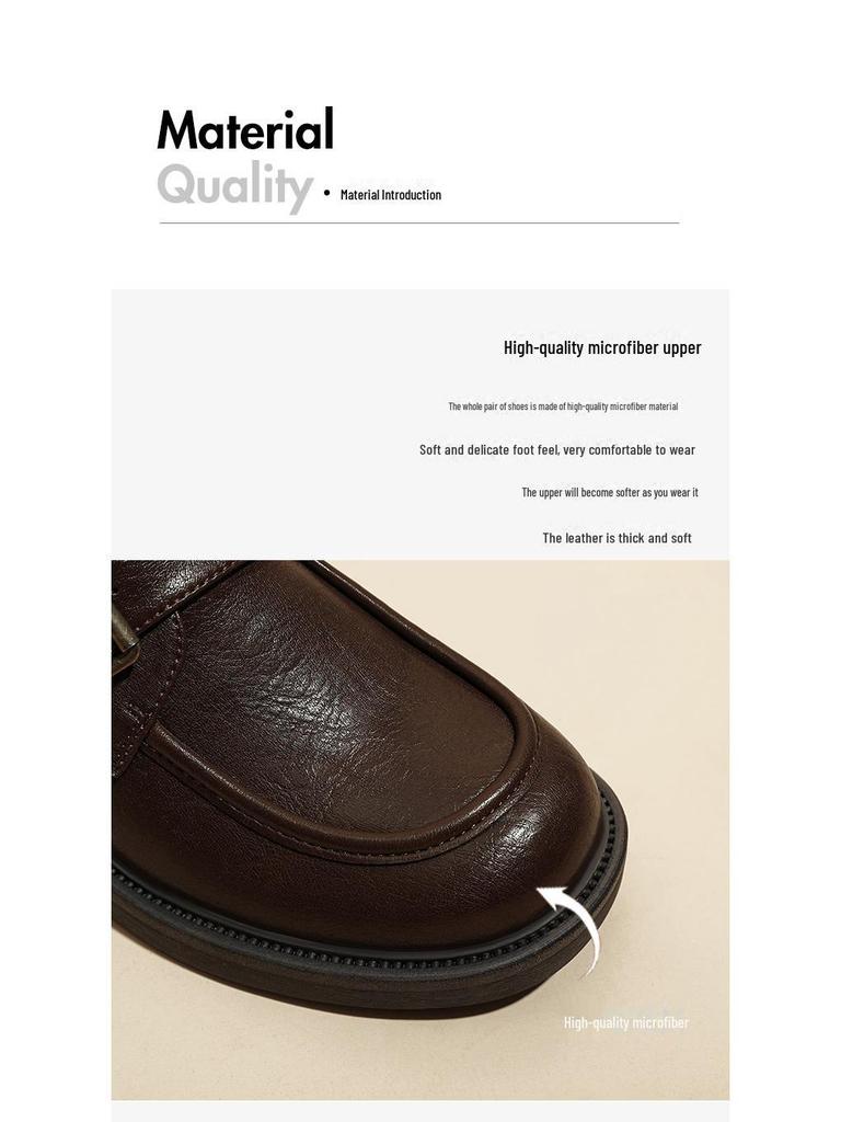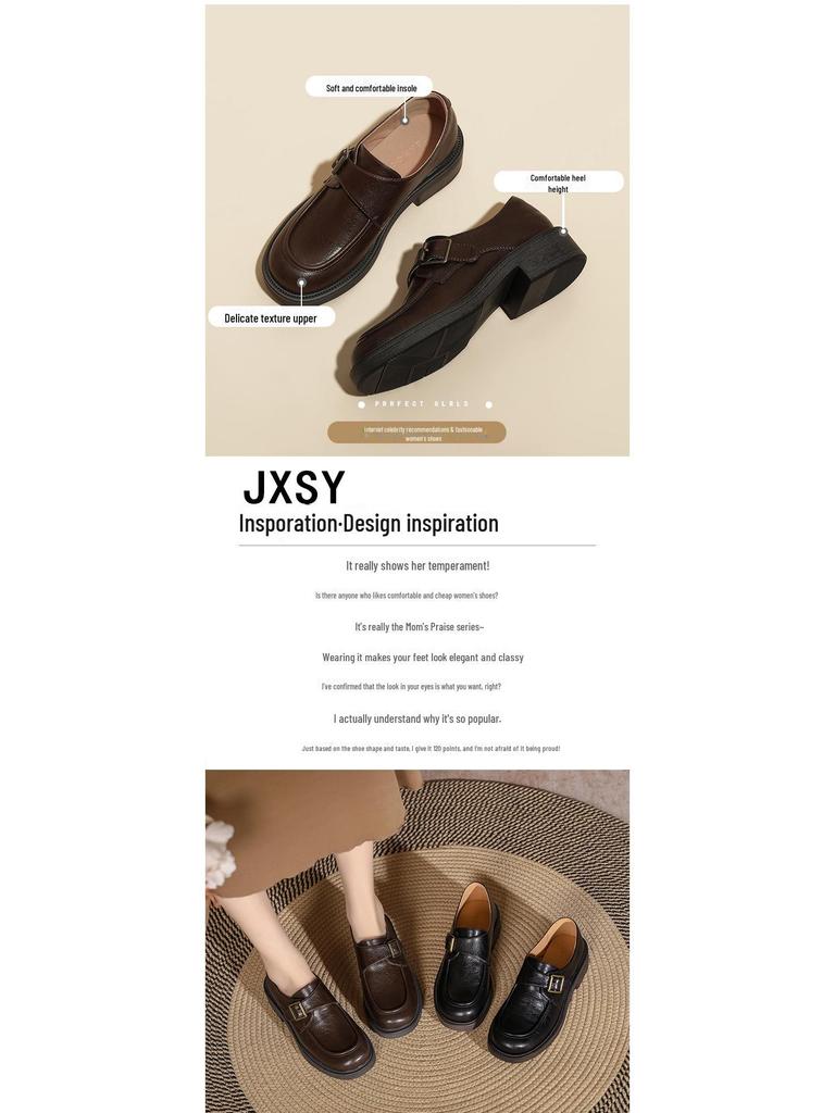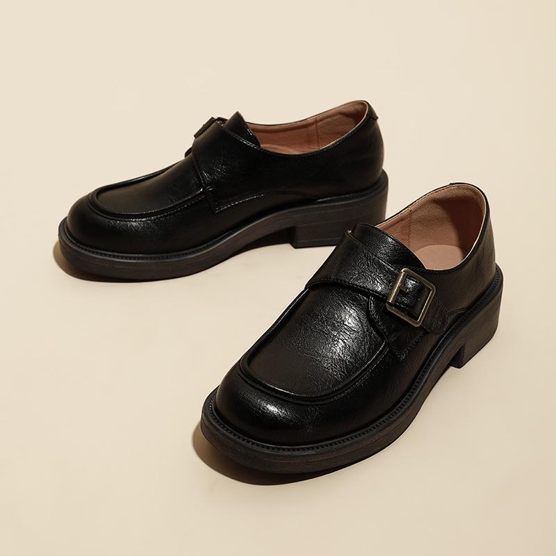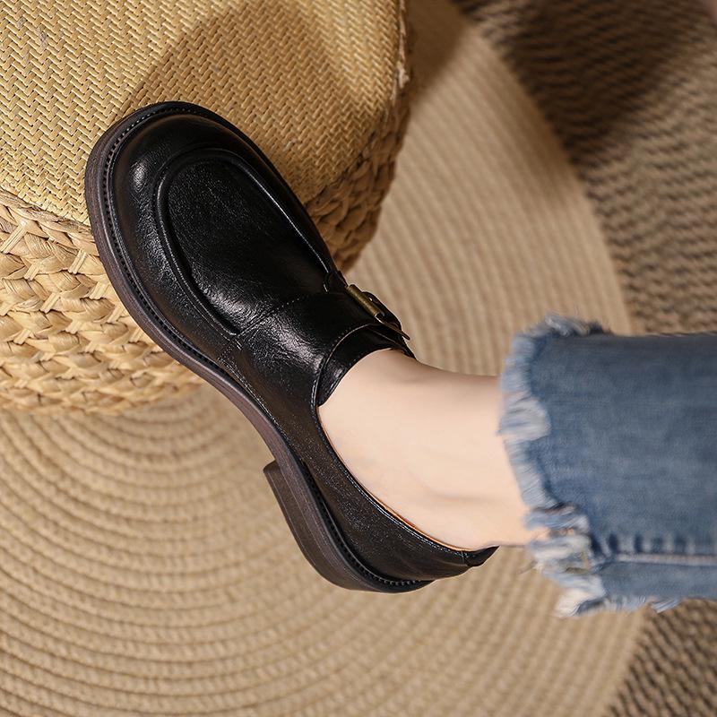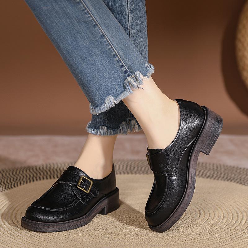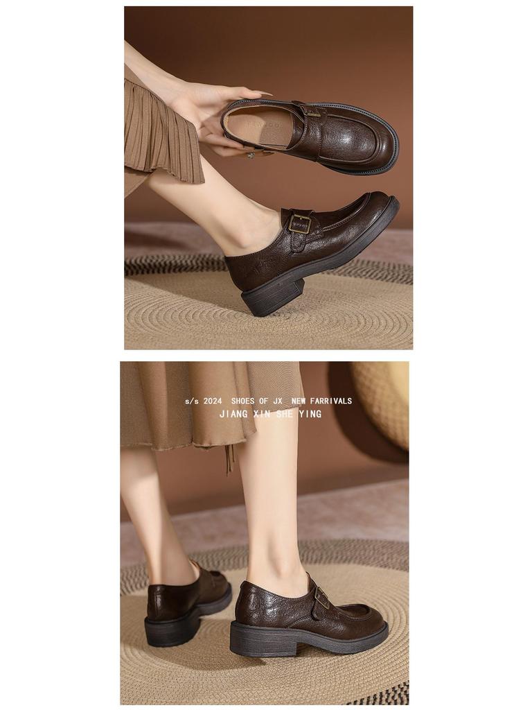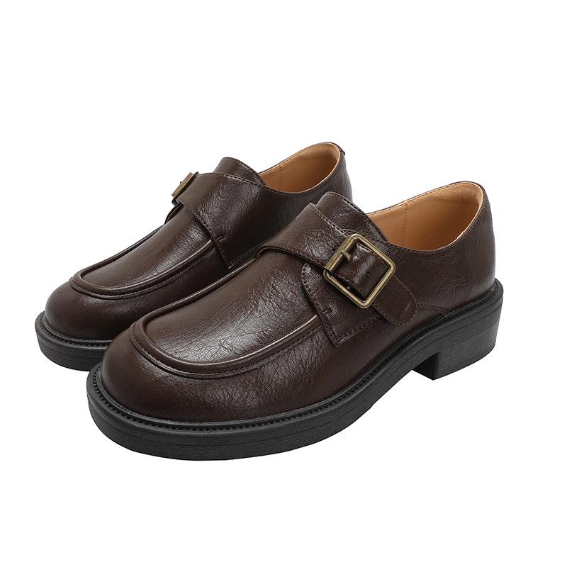 Женские коричневые кожаные мокасины в стиле ретро: Британский стиль, толстый каблук, пряжка сбоку, универсальный комфорт для осени и зимы