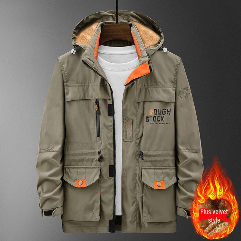 Мужская куртка средней длины с капюшоном для активного отдыха - осень/зима, плюс бархат, множество карманов, свободный крой