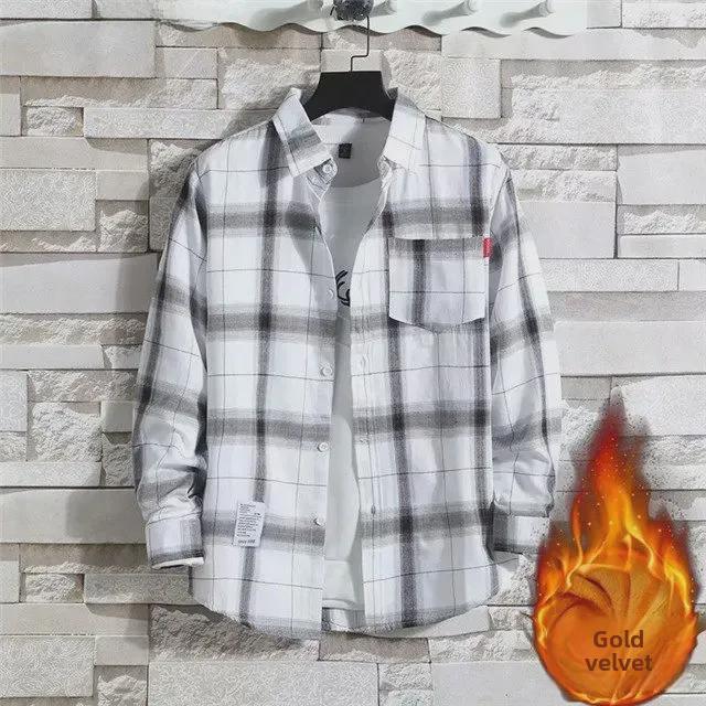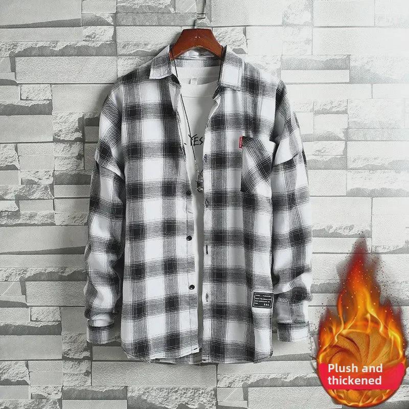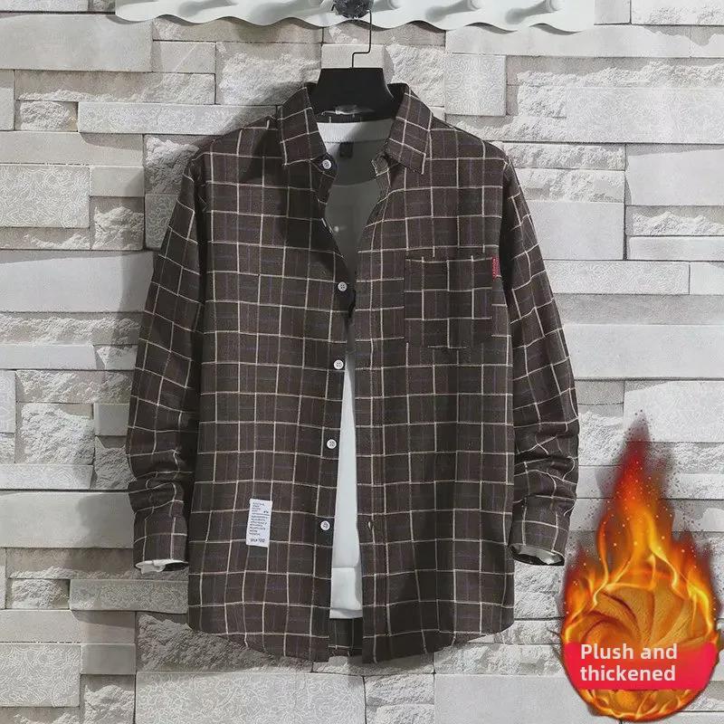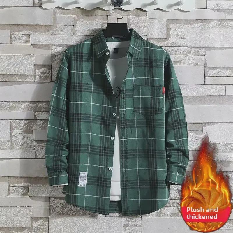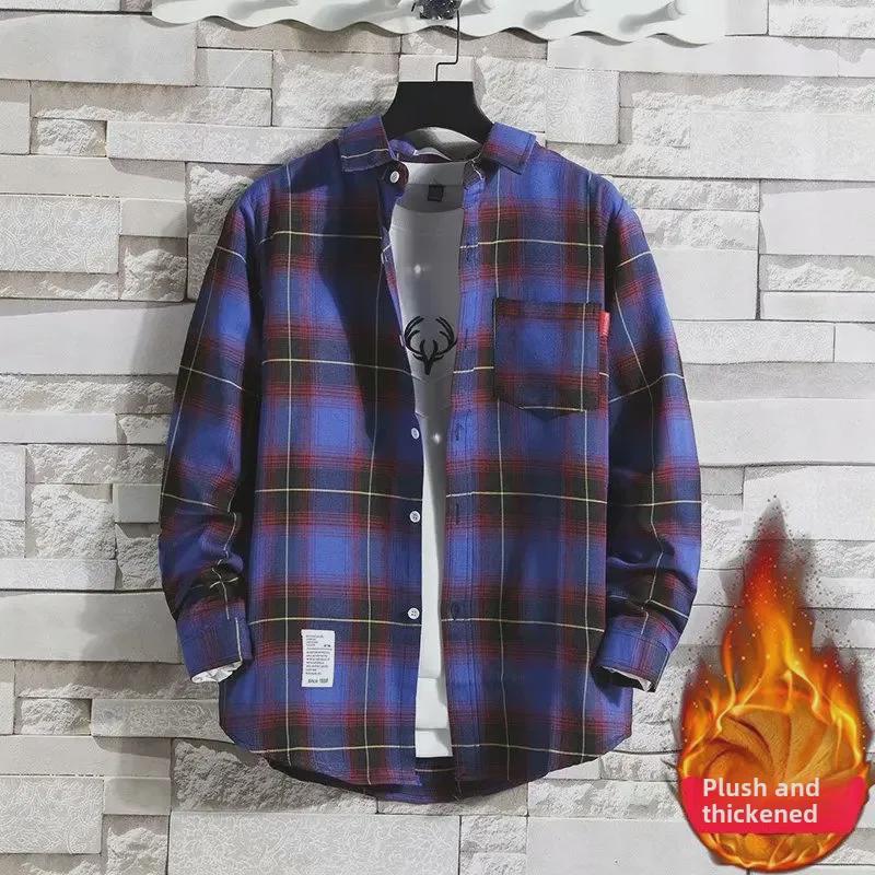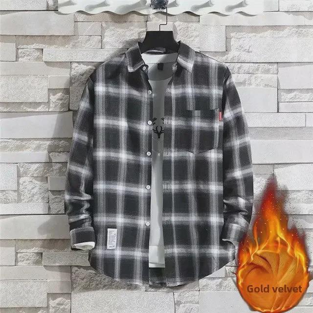 2024 Мужская теплая рубашка из бархата с длинным рукавом в клетку - Осень/Зима в корейском стиле