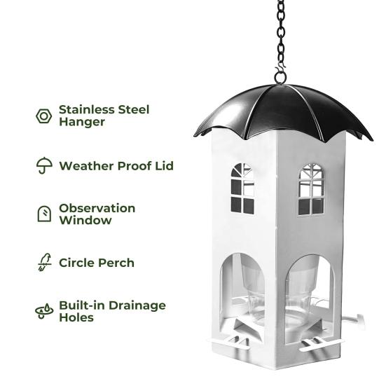 Прочная металлическая конструкция: Кормушка изготовлена из прочного металла и устойчива к жеванию, что помогает предотвратить повреждения белками и снижает затраты на кормление птиц.
