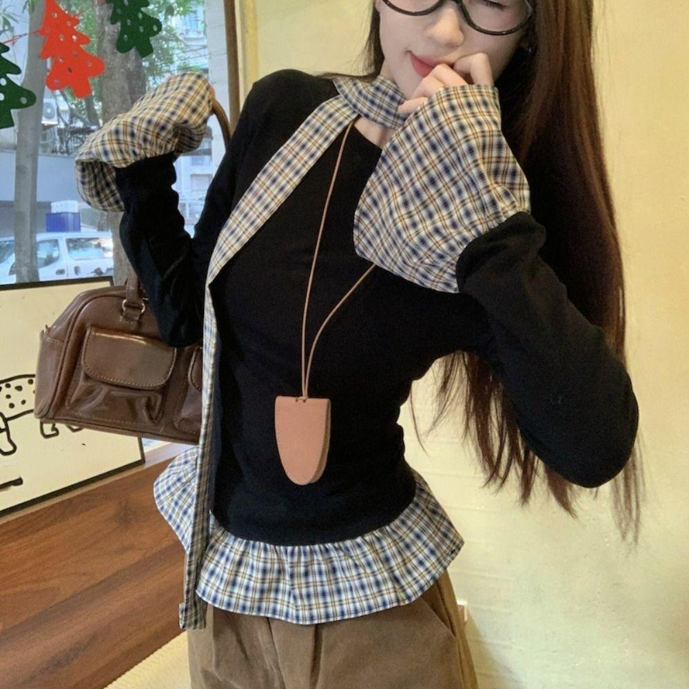 Lattice Ruffle Long Sleeve Top Sweet Slim Fit Top Comfortable Faux Two Piece T Shirt Spring