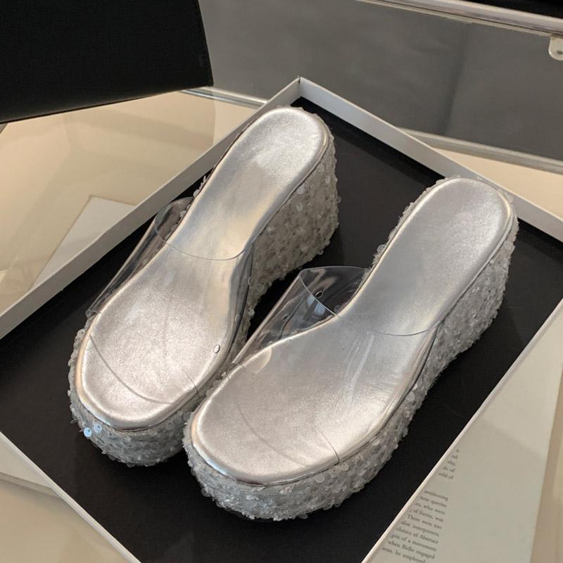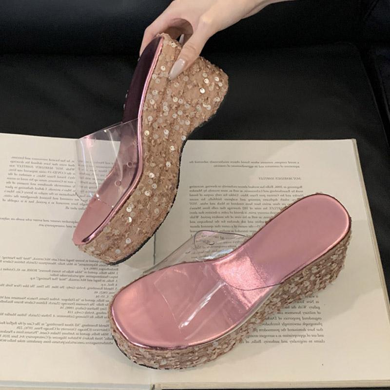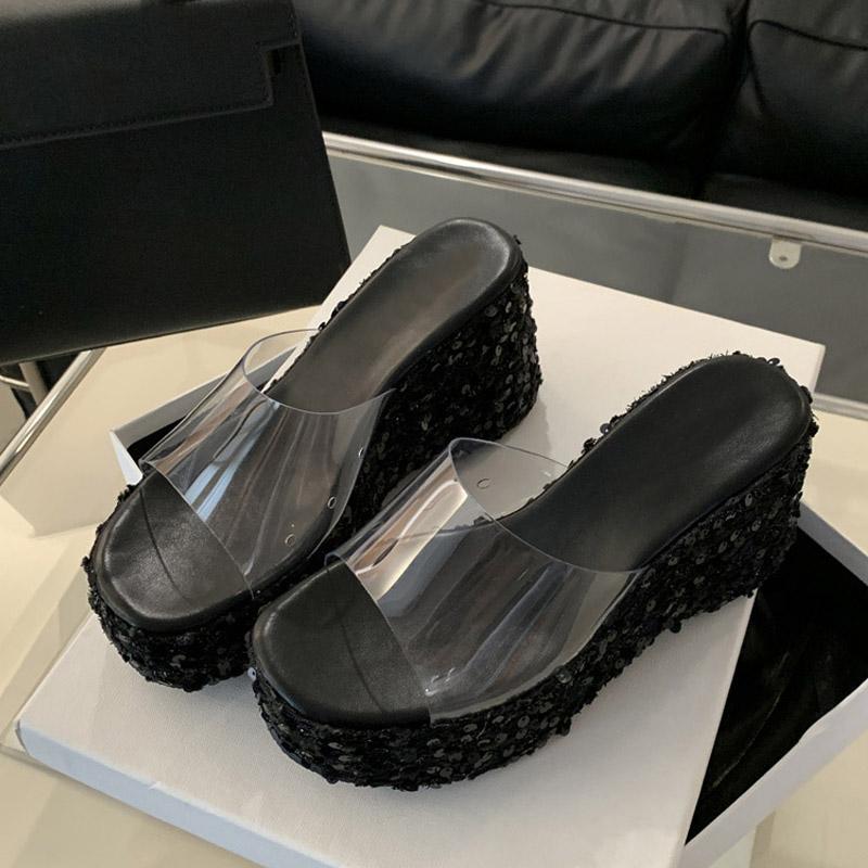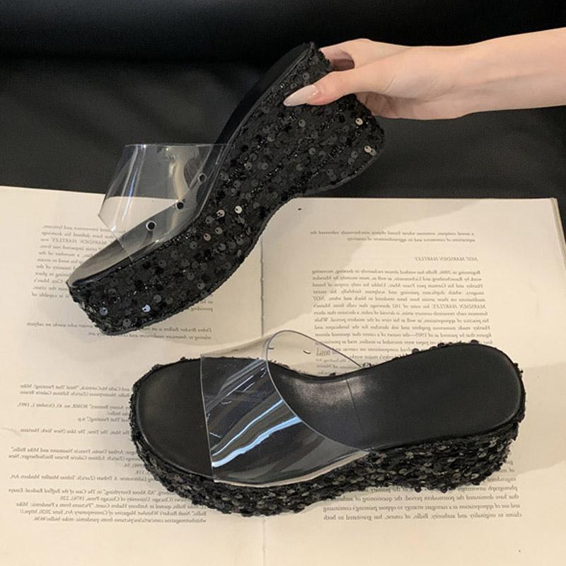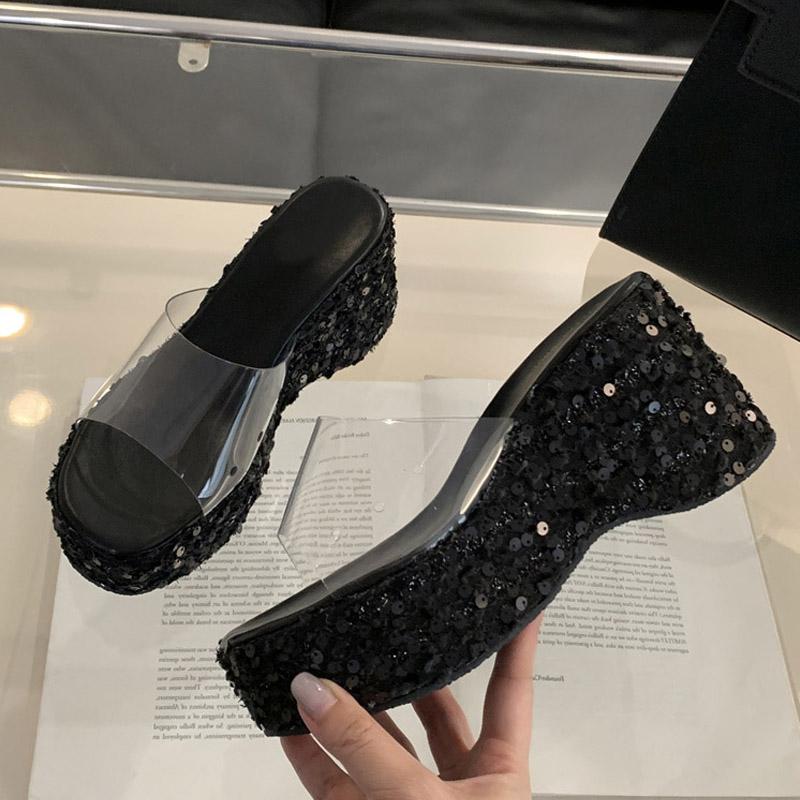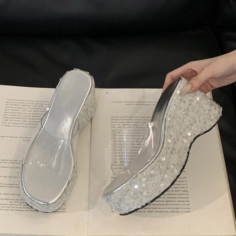 Liyke Новая Мода Блестящие Клинья на Платформе Шлепанцы Женские С Открытым Носком ПВХ Прозрачные Сандалии Женская Обувь Высокие Каблуки Zapatos Mujer