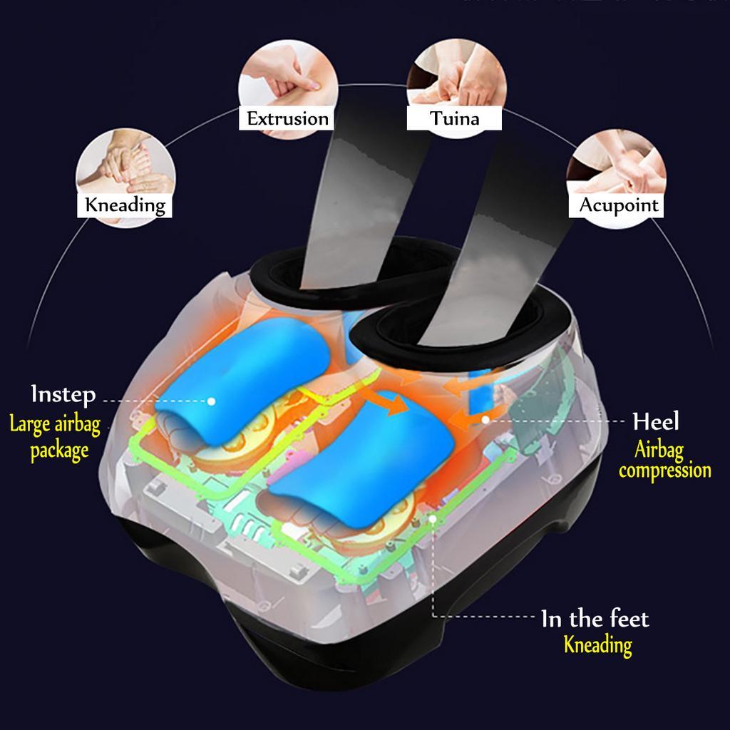 - Особенности продукта: Лечение стоп, массаж акупунктурных точек, активация вен, снятие усталости, полное обертывание подушки безопасности, теплый нагрев ног при 20-40°C, 3 режима, регулировка интенсивности.