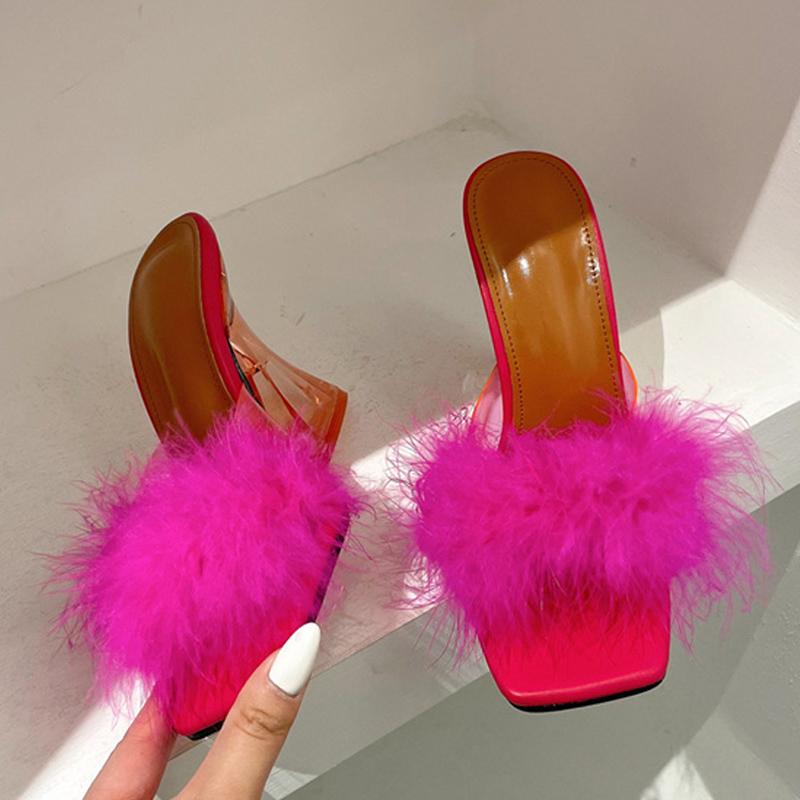 Размер 35–41, пикантные странные прозрачные тапочки на каблуке, модные летние сандалии с меховыми перьями, прозрачные туфли без шнуровки с открытым носком, женские шлепанцы