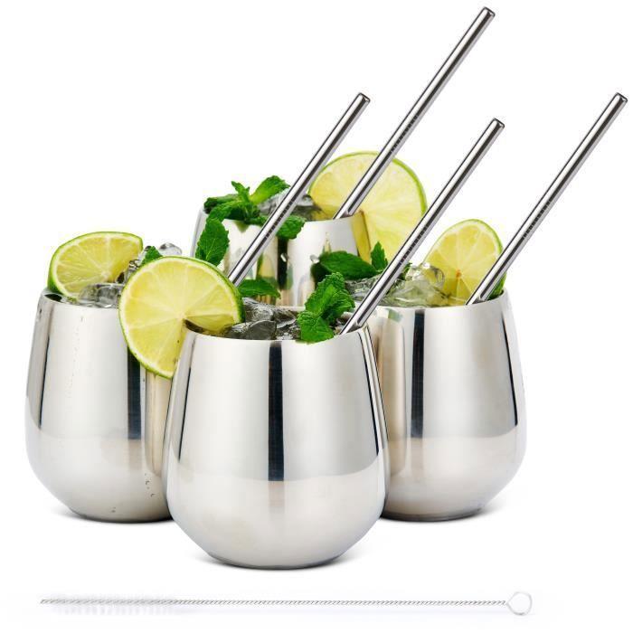 Verres à vin sans pied - oak & steel - acier inoxydable - 350ml - inclus 4 pailles et 2 brosses