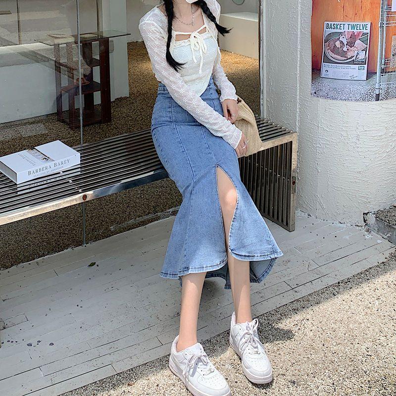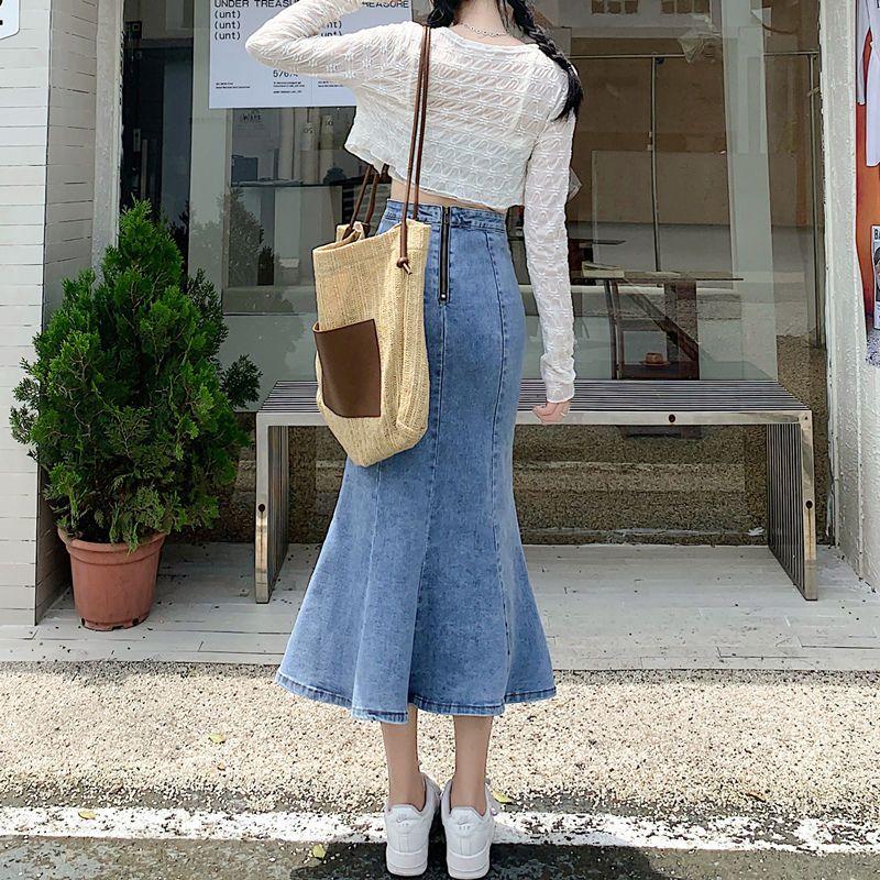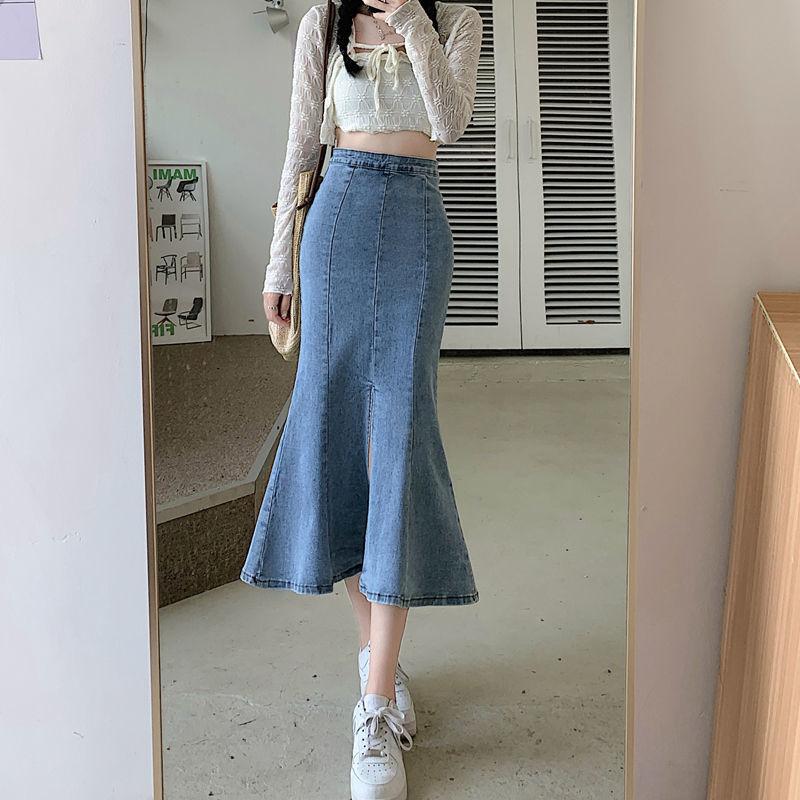 Эластичная джинсовая юбка-рыбий хвост Юбка с разрезом посередине Юбка средней длины Юбка, облегающая бедра Юбка-карандаш Маленькая джинсовая юбка