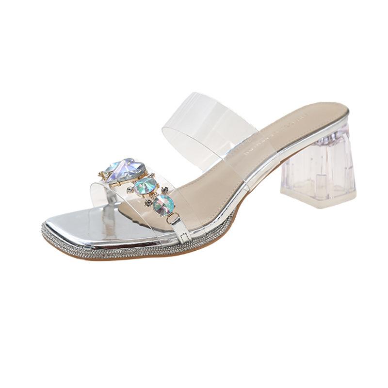 Лето 2025 новые прозрачные сандалии с квадратным носком и толстым каблуком, уличные сандалии с надписью из страз от интернет-знаменитости, французский темперамент, крутая женщина