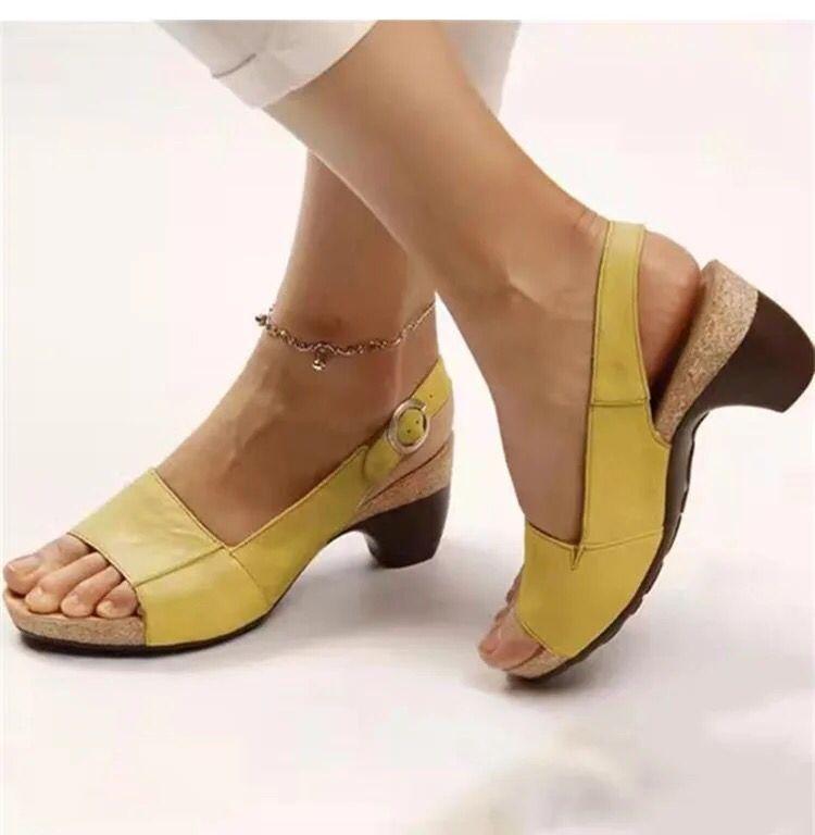 Новинка 2025 года, летний новый продукт, средний каблук, толстая подошва, пряжка, сандалии в форме рыбьего рта, женские, большого размера, толстый каблук 40-43Сандалии