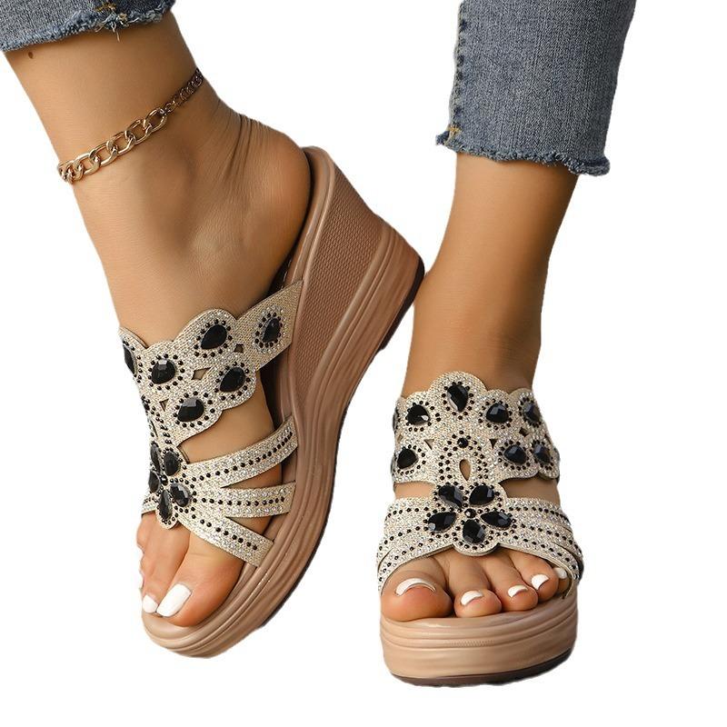Импортные товары большого размера 2025 года, лето, новые ретро-повседневные женские туфли на танкетке со стразами и высоким каблуком с одним символом 43