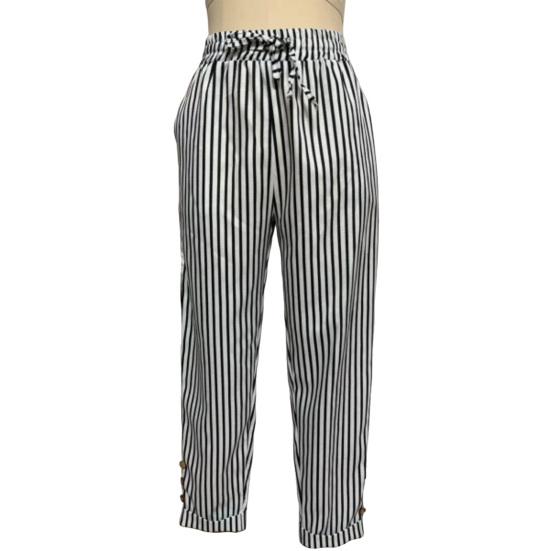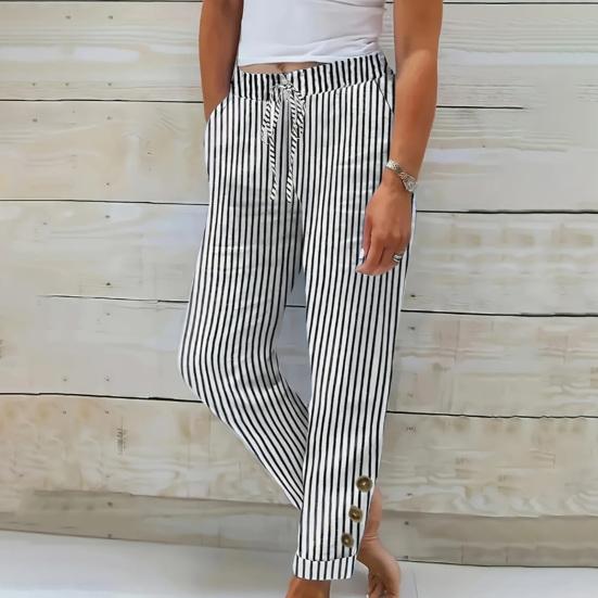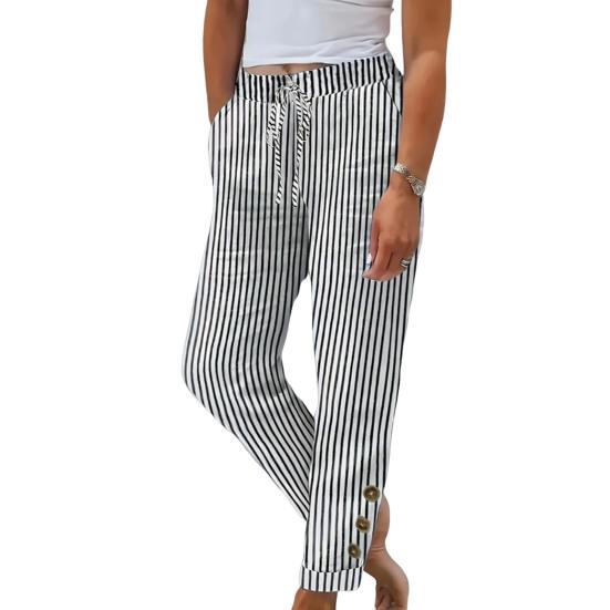 Стильные варианты сочетания: Эти льняные брюки в сине-белую или черно-белую полоску с пуговицами и разнообразными фасонами можно легко сочетать с жилетом, топом, рубашками или блузками, создавая повседневный, но в то же время шикарный ансамбль.. Поднимите свой стиль на новый уровень с этими универсальными шароварами, которые открывают бесконечные возможности для создания стильных образов.