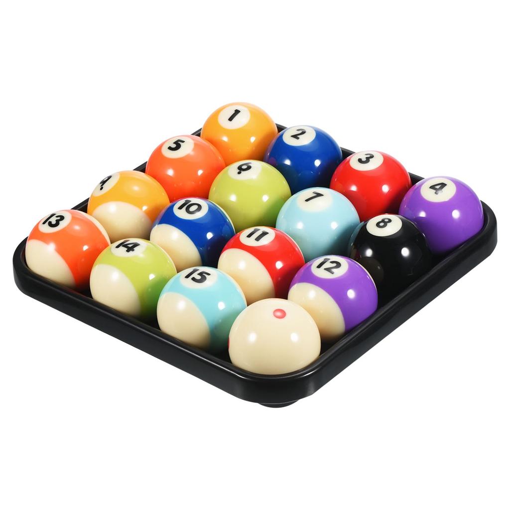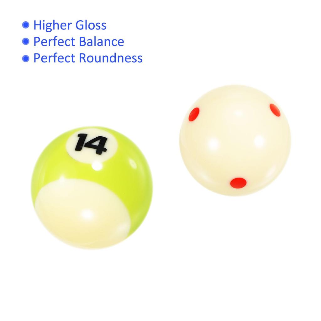 Количество включает в себя: 1 комплект бильярдных шаров (16 штук), размер 57,2 мм, включая 6 тренировочных битков, 1 шар с красной точкой, 8 однотонных шаров, 7 полосатых шаров.