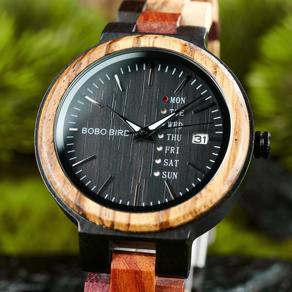 Деревянные часы BOBO BIRD Красочные деревянные часы с дисплеем даты и дня Многофункциональные кварцевые часы ручной работы Спортивный хронограф Уникальные мужские и женские (Пара)