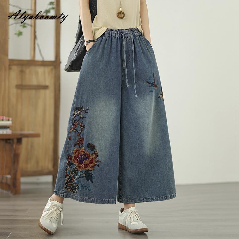 Большие размеры весна-лето женские синие широкие джинсы с высокой талией на шнурке с цветочной вышивкой повседневные свободные джинсовые капри винтажные мешковатые женские джинсы