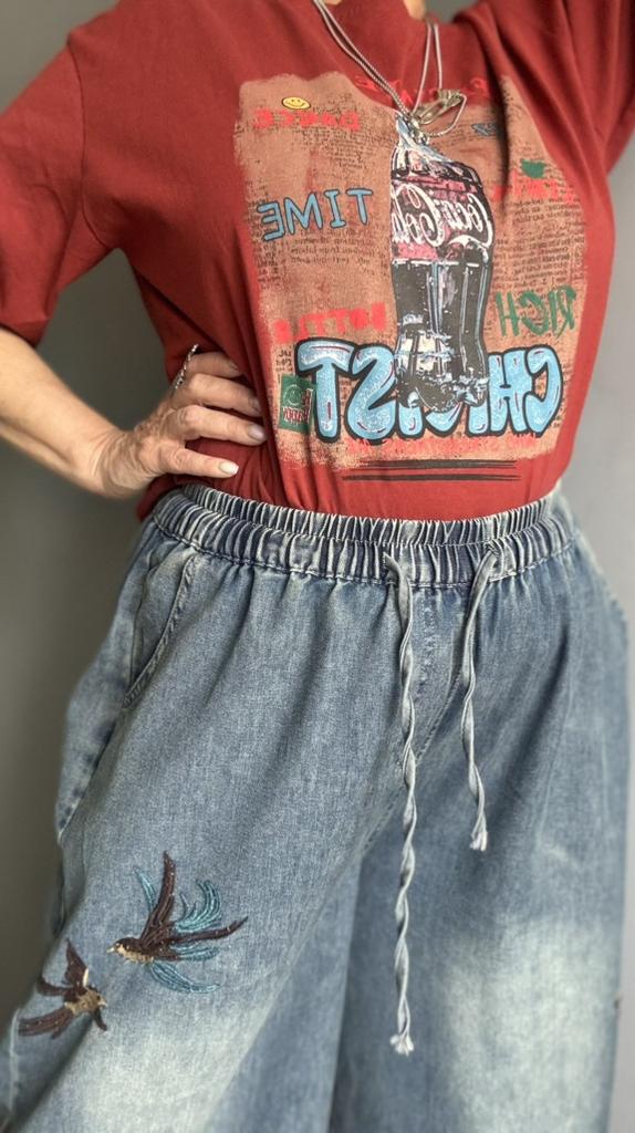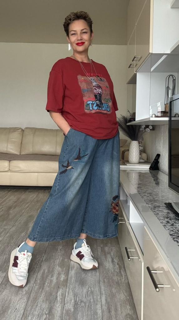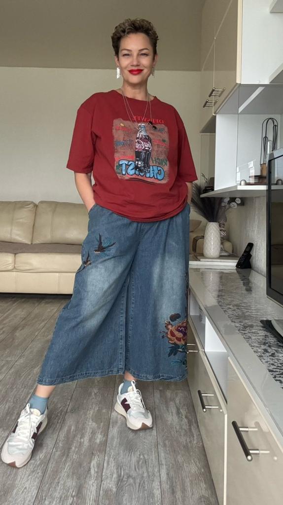 Летние джинсовые кюлоты с вышитыми цветами ✔️Размеры М-2XL Мои параметры: 167, 98-85-100 На мне размер 2XL Брюки сели свободно, можно было бы взять на размер меньше ✔️Фасон: Посадка высокая На талии резинка и шнурок Отверстия для шнурка обработаны Боковые карманы глубокие Сзади накладные карманы На брючинах вышитые узоры С одной стороны -цветы, с другой- птицы ✔️Тань: Легкая, тонкая, летняя джинса Местами потертости Не тянется Вышивка плотная, машинная На моем экземпляре вышивка местами покрыта чем- то вроде катышков- видимо, из-за большого количества ниток Пошив фабричный ✔️Замеры: ОТ 72-112 ОБ 136 Высота посадки 36 Длина внутреннего шва 52 Длина 89 Ширина брючины внизу 43 Ширина брючины в районе бедра 40