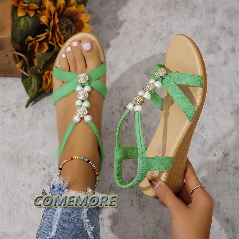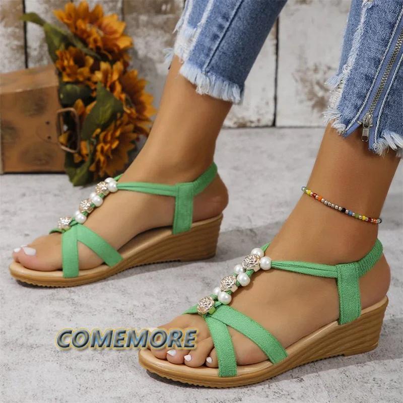 Женские босоножки на танкетке с бусинами, туфли на платформе, летние пляжные тапочки 2024 года, дизайнерские новые шлепанцы, туфли-лодочки Femme Zapatos Slides