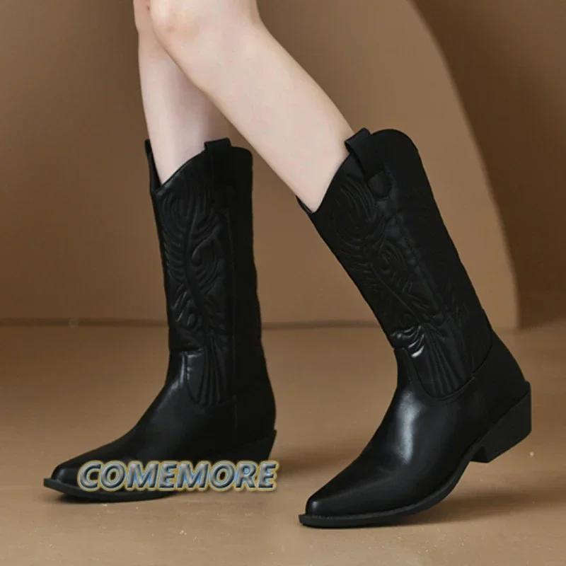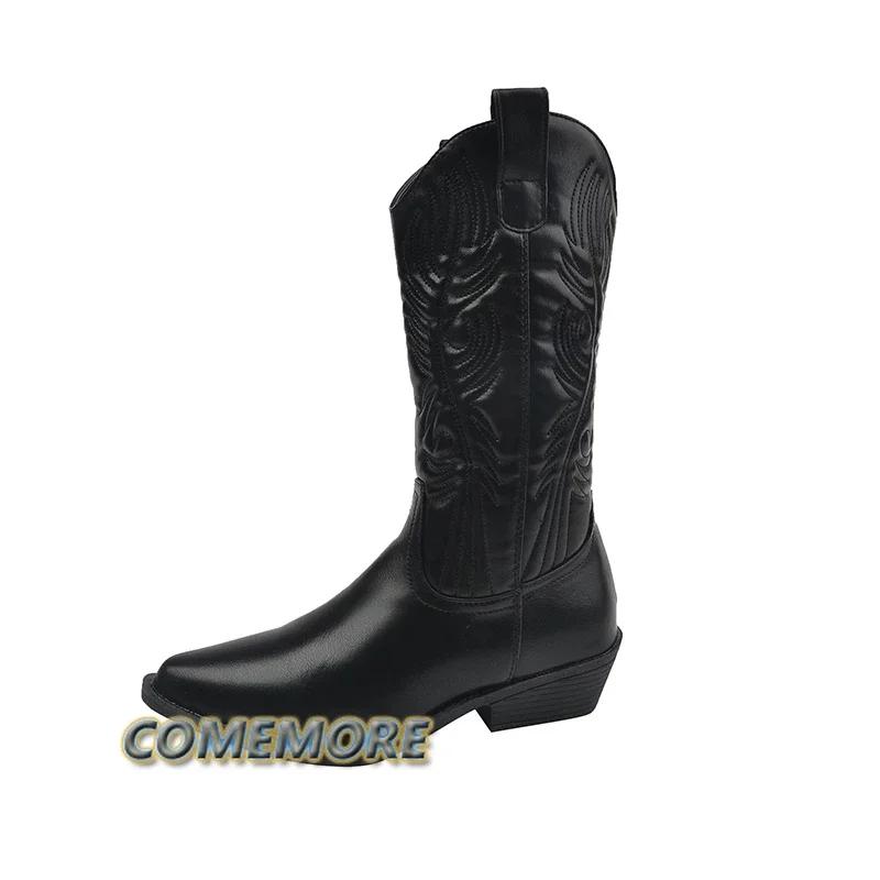 Черные сапоги для верховой езды на толстом каблуке до середины голени для женщин 2024 года, зимняя женская обувь, женские модные ковбойские сапоги с острым носком, комфорт