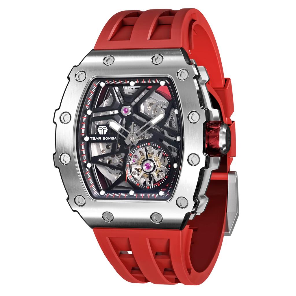Часы TSAR BOMBA мужские деловые 50M водонепроницаемые скелетонированные мужские часы стильные из нержавеющей стали с циферблатом-бочкой для мужчин светящийся японский механизм красный силиконовый ремешок