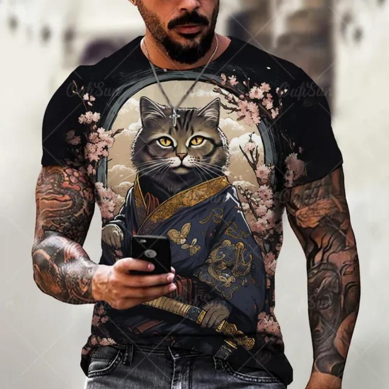 Мужские футболки, японская футболка с принтом самурая и кота, забавные футболки с 3D рисунком животных, повседневные свободные топы с круглым вырезом, футболка с короткими рукавами