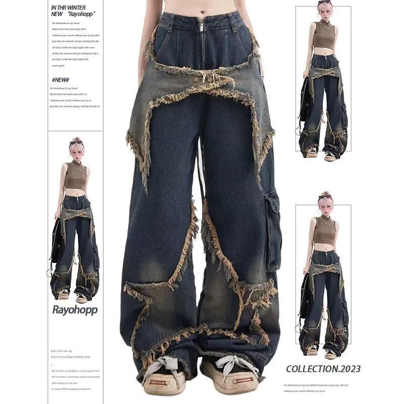 Мужские джинсы широкого кроя в стиле ретро с рисунком пентаграммы — потертости, необработанные края, большие карманы — купить товар онлайн с бесплатной доставкой по всему миру!
