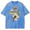 Женская футболка в японском стиле с рисунком акулы и потертым рисунком, стираная джинсовая ткань, свободный унисекс, короткий рукав, милый топ отаку