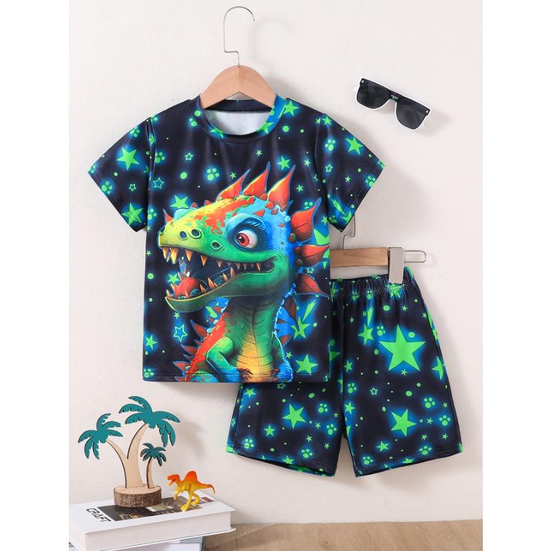 Направленный хит продаж, летний костюм для мальчиков с принтом динозавра и звезд, шорты с короткими рукавами, абстрактный стиль