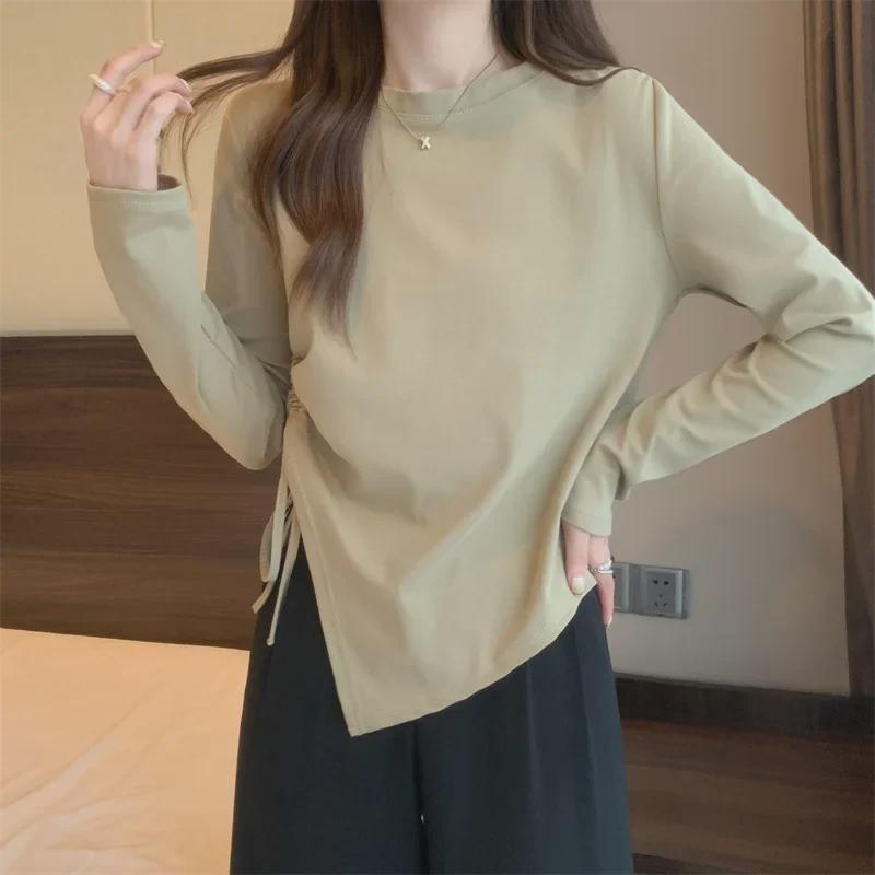 Корейская весна 2025 женская универсальная футболка с длинным рукавом и завязками, нестандартный дизайн, облегающий крой