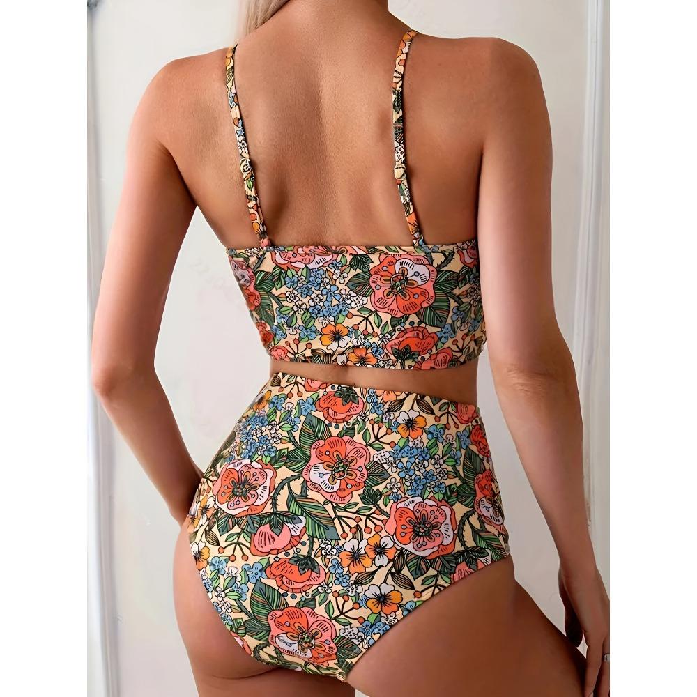 [Высокоэластичный бикини с цветочным принтом] Элегантный комплект бикини с цветочным принтом для женщин, купальники