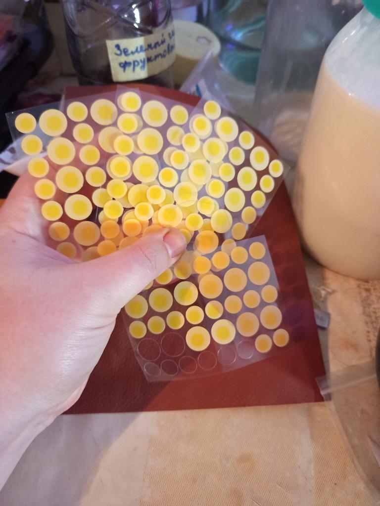 Наконечник интересные. Приехало 4 листочка с очень плотными кружочками, еле отодрала. Купила, что бы приклеить бесячую родинку на ножке. Продавец заявил, что это избавит от надоевший кожных выростов. Не очень верится, но посмотрим выглядит соответственно описанию. Рекомендую к покупке Дополняю: удивительно, но сработало, пусть и частично. Очень мелкие наросты исчезли, а точнее отвалились через неделю регулярного применения наклеек. Сначала место нароста щипалось, как при мелкой ранке, но потом я ещё раз закончила и через пару дней неудобства исчезли. Крупные наросты так и остались. Но все равно заявленный эффект проявился Дополняю: бесячая родинка отпала незаметно. Если бы я регулярно меняла пластыри, а не время от времени, это произошло ты раньше. Итог: действие эмпирически доказано. Закажу ещё и рекомендую к покупке