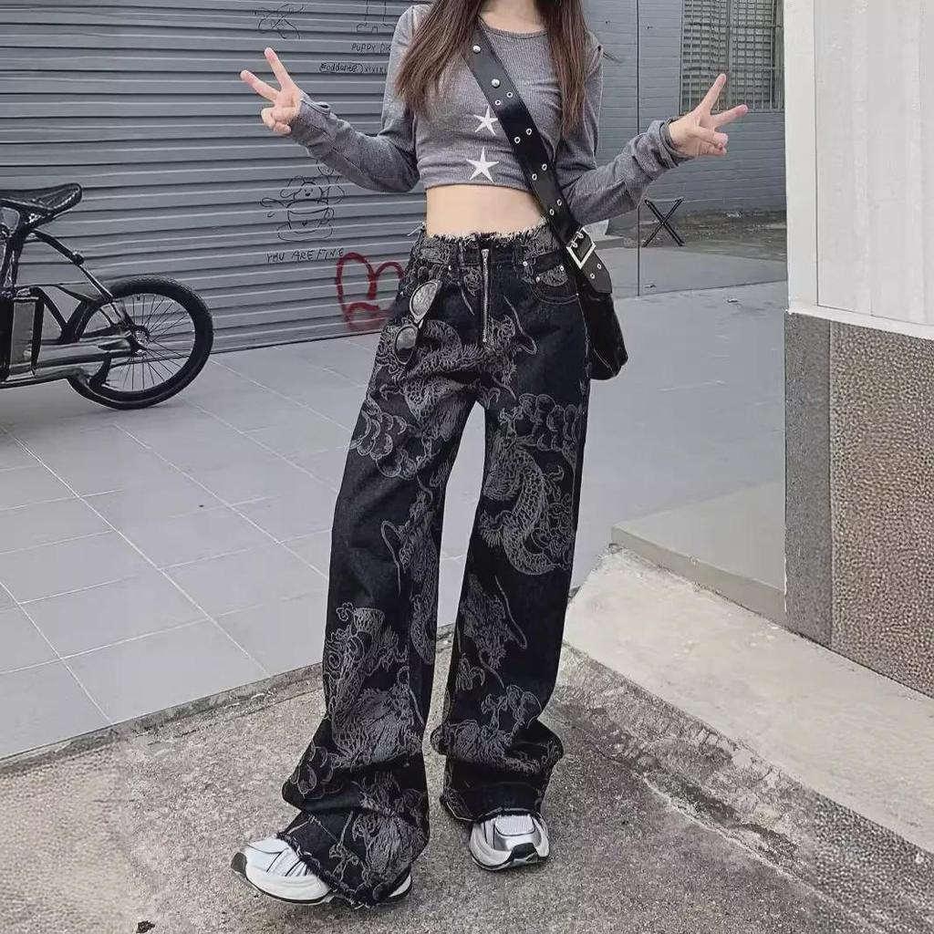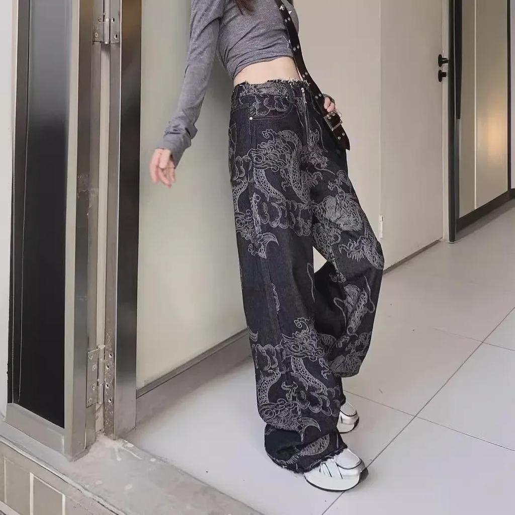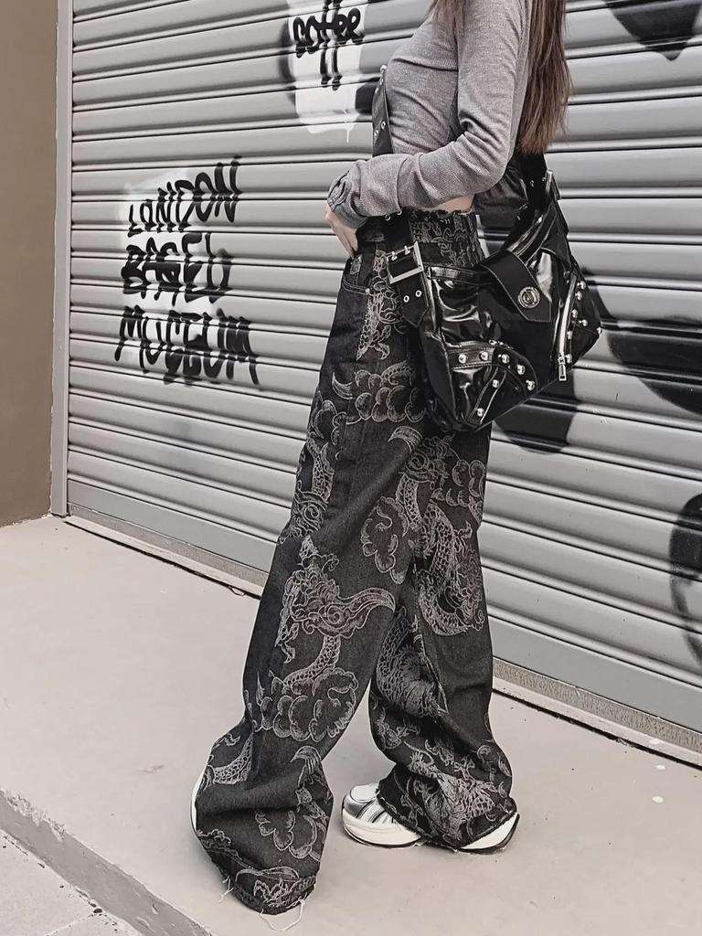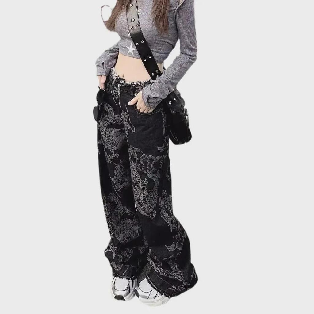 Женские джинсы с высокой талией и широкими штанинами с принтом дракона