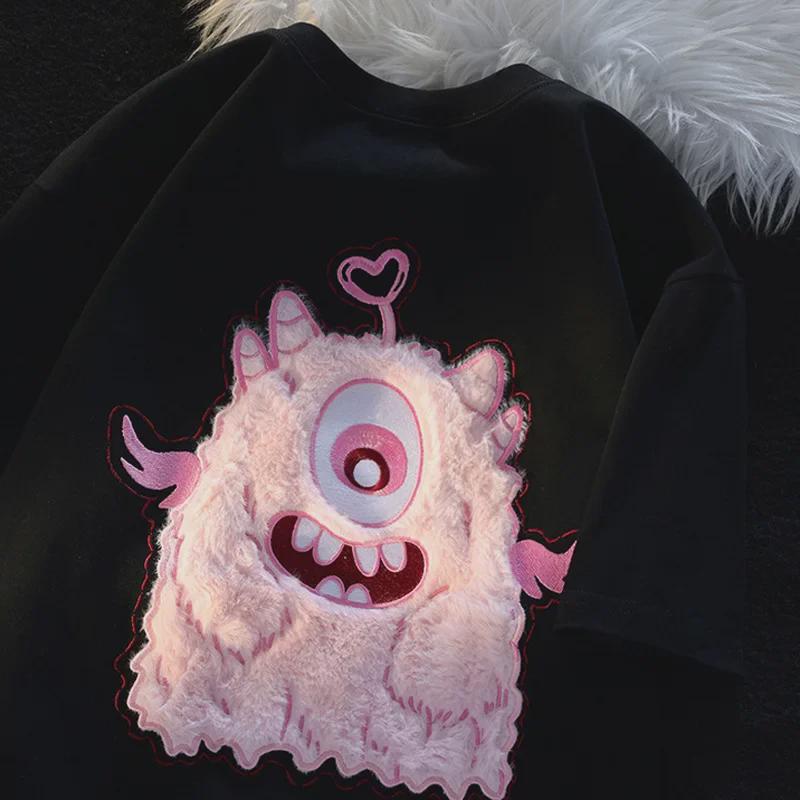 Женская розовая футболка из хлопка с вышитым ретро-монстром, с короткими рукавами, в стиле High Street Fashion, свободного кроя — купить товар онлайн с бесплатной доставкой по всему миру!