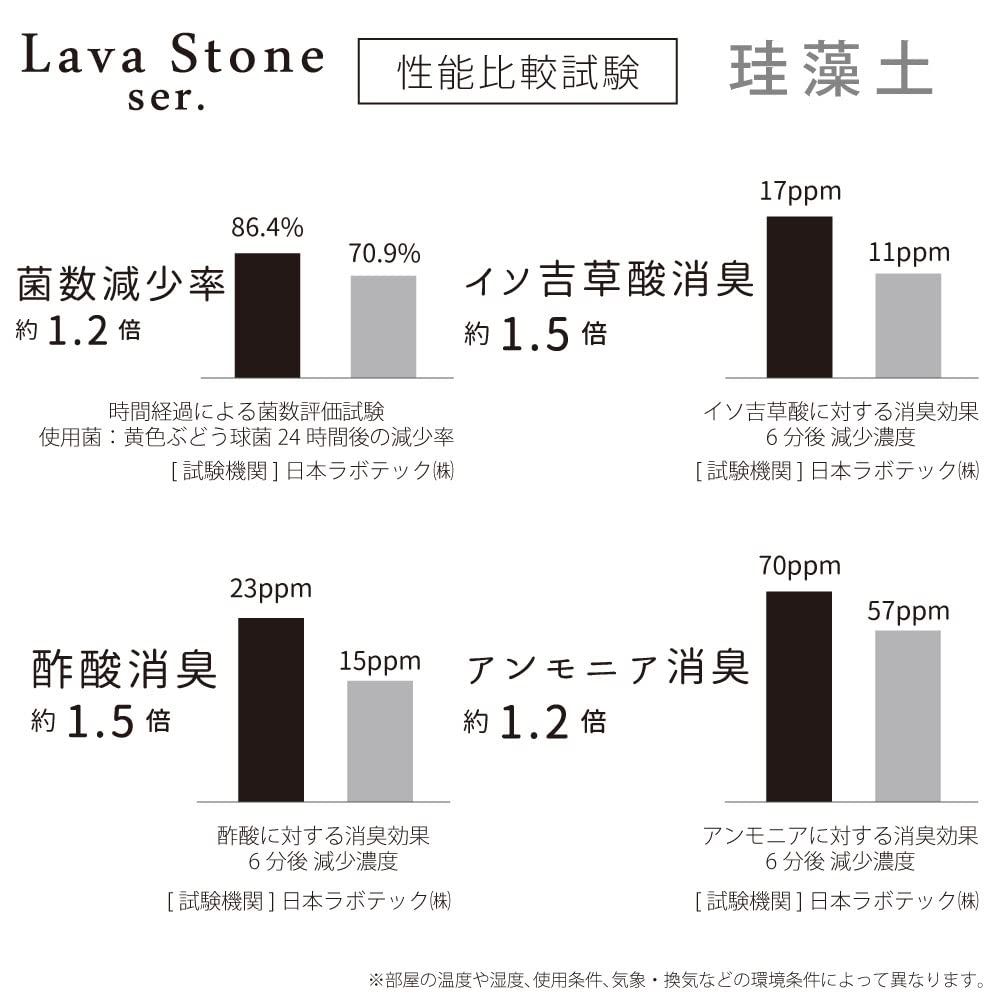 Продукт сравнили с нашим обычным продуктом на основе диатомита в испытательном институте, и было подтверждено, что его эффективность примерно в 1,2–1,5 раза выше с точки зрения водопоглощения, высыхания, дезодорирующего эффекта и скорости снижения количества бактерий.