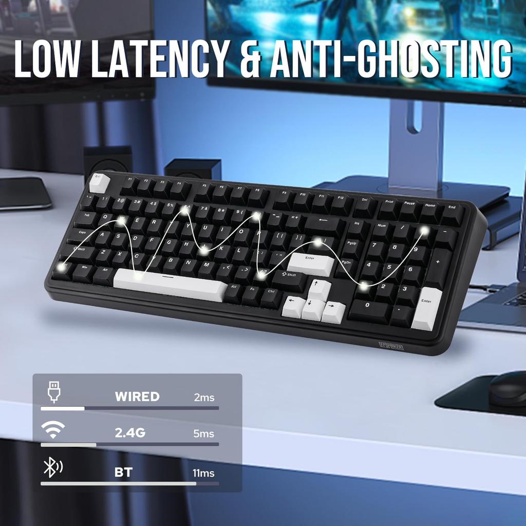 - Tri-mode wireless & cross system compatible: EPOMAKER TH99 wireless keyboard is equipped with a top-notch 4000mAh battery and can be used continuously for up to 800 hours when the backlight is off. It achieves low latency of only 2-5ms in wired/2.4G mode, delivering the best performance on a variety of devices such as PCs, tablets, smartphones, and game controllers. You can easily switch between Mac and WIN mode while enjoying the wireless convenience of Bluetooth 5.0 and 2.4GHz connectivity. Enjoy the superior performance of the EPOMAKER TH99 keyboard for everything from gaming to work to everyday data entry.