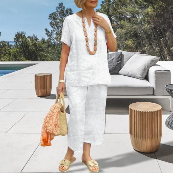 Этот комплект из двух предметов изготовлен из смеси хлопка и льна, представляющей собой дышащую и легкую ткань, которая обеспечивает комфорт весной, летом и осенью.. Свободный крой не только дополняет ваш силуэт, но и обеспечивает комфорт.. Простой однотонный дизайн делает его универсальным для ежедневного ношения и подходит для разных типов телосложения и возрастных групп..