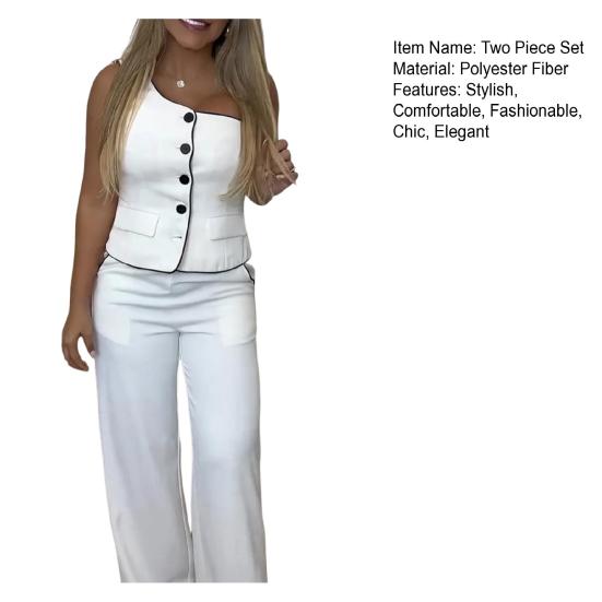 Функциональный дизайн: Этот комплект, состоящий из топа с круглым вырезом и однобортной застежкой, а также брюк с удобными карманами, гармонично сочетает в себе моду и функциональность.. Белый цвет добавит элегантности вашему ансамблю, сделав его идеальным для всех типов фигур и возрастов.