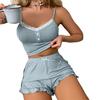 Расслабление без усилий: Наслаждайтесь отдыхом со стилем в нашем свободном и повседневном пижамном комплекте. Топы и шорты на подтяжках обеспечивают удобную посадку, позволяя вам без усилий расслабиться дома, чувствуя себя непринужденно в своем собственном пространстве.