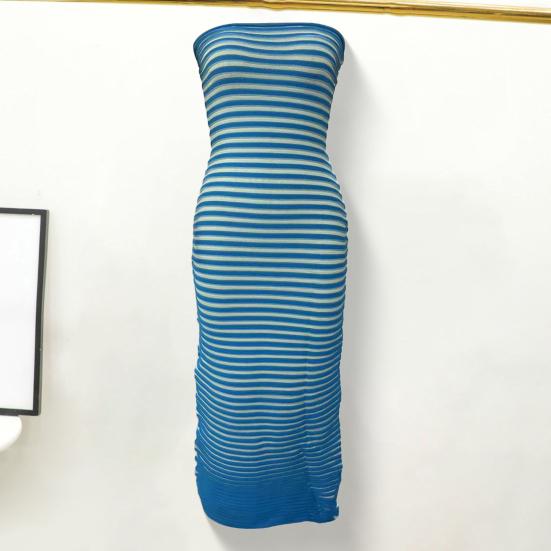 Это элегантное женское платье изготовлено из смеси полиэстера и спандекса, что обеспечивает мягкость и комфорт при высокой эластичности.. Простой, но стильный полосатый дизайн подчеркивает элегантность, а покрой без рукавов красиво подчеркивает вашу руку.. Это платье с облегающим кроем без бретелек, подчеркивающим талию, подчеркнет ваш силуэт благодаря своему Т-образному профилю.. Вязаный полосатый узор добавляет нотку изысканности общему образу..