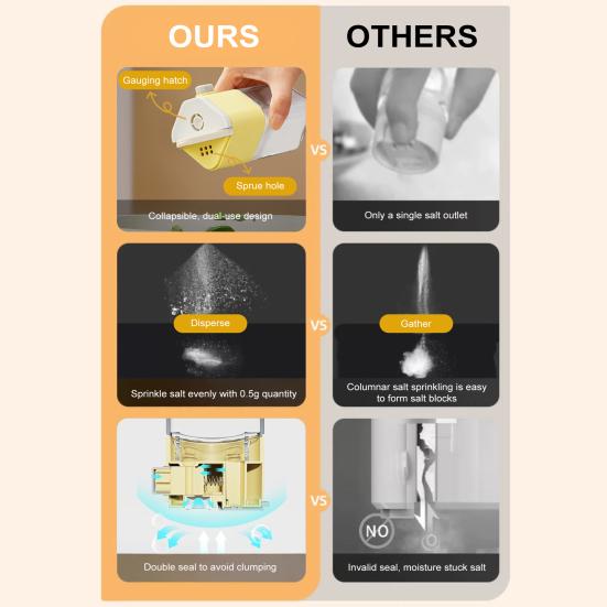 Равномерное распределение и герметизация: Инновационная наклонная конструкция с разделением обеспечивает равномерное распределение соли, а наклон отвода предотвращает попадание влаги, сохраняя свежесть соли и предотвращая ее комкование.