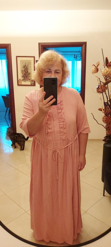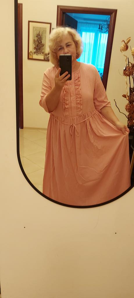 Платье милое.Сначала смутила длина.Чуть не до циколотки.Хотела обрезать,но поняла,что потеряются пропорции кроя.Привыкла и довольна всем.