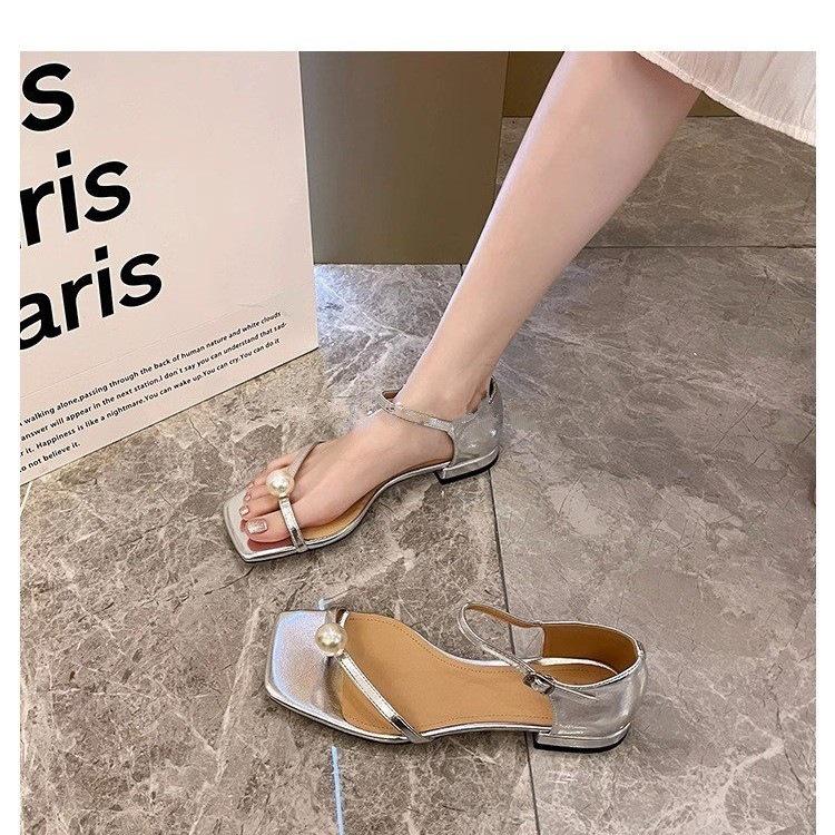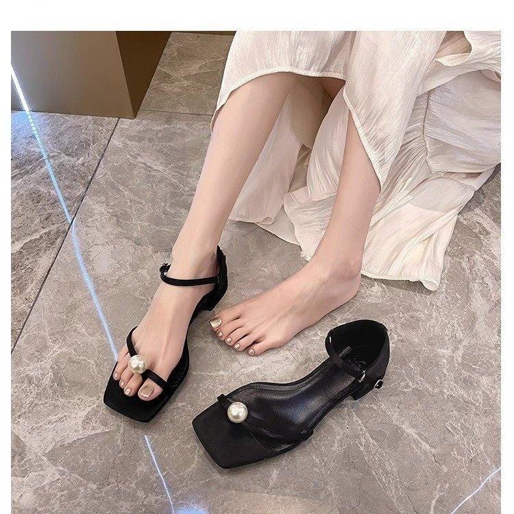 Туфли на высоком каблуке женские летние 2025 новые толстые каблуки жемчужные с черной верхней одеждой темперамент квадратный носок босоножки на низком каблуке