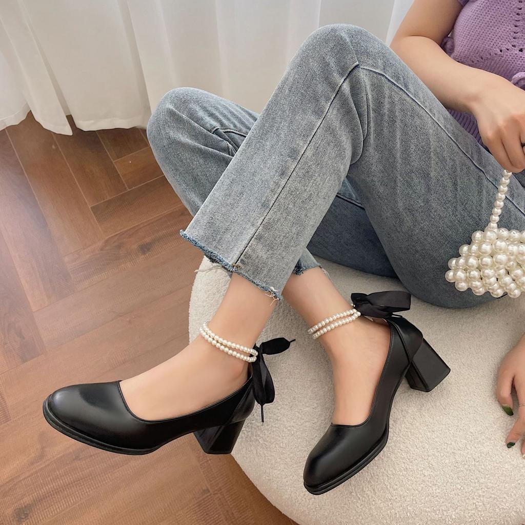 Туфли Мэри Джейн 2025 года, новые туфли с цепочкой и жемчугом, на высоком каблуке с квадратной головкой, с толстым каблуком, с легким ртом, универсальные одинарные туфли