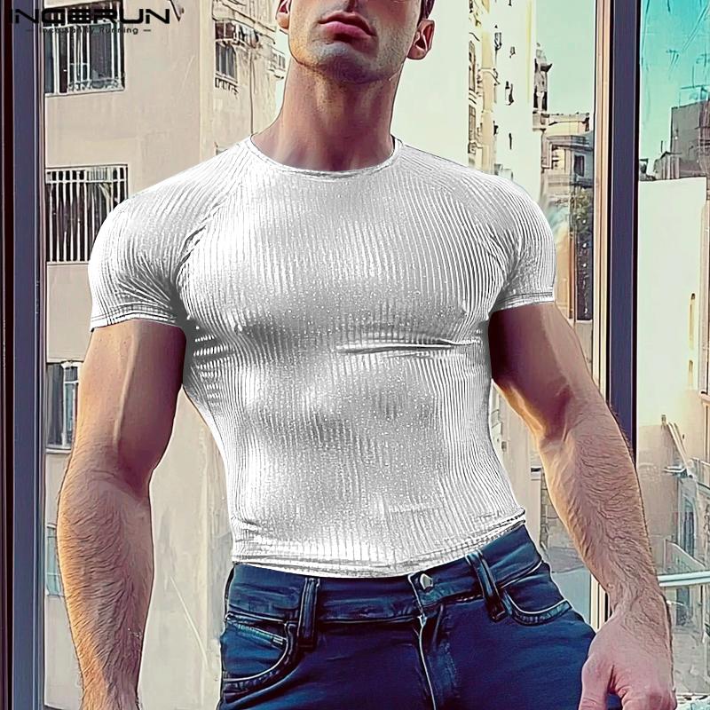 INCERUN Летние мужские футболки с коротким рукавом и круглым вырезом, с блестками, повседневные, облегающие — купить товар онлайн с бесплатной доставкой по всему миру!