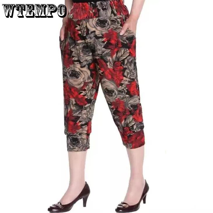 WTEMPO Свободные укороченные брюки для мам, эластичные брюки средней длины с высокой талией, тонкие напечатанные женские брюки из ледяного шелка, широкие брюки на весну и лето
